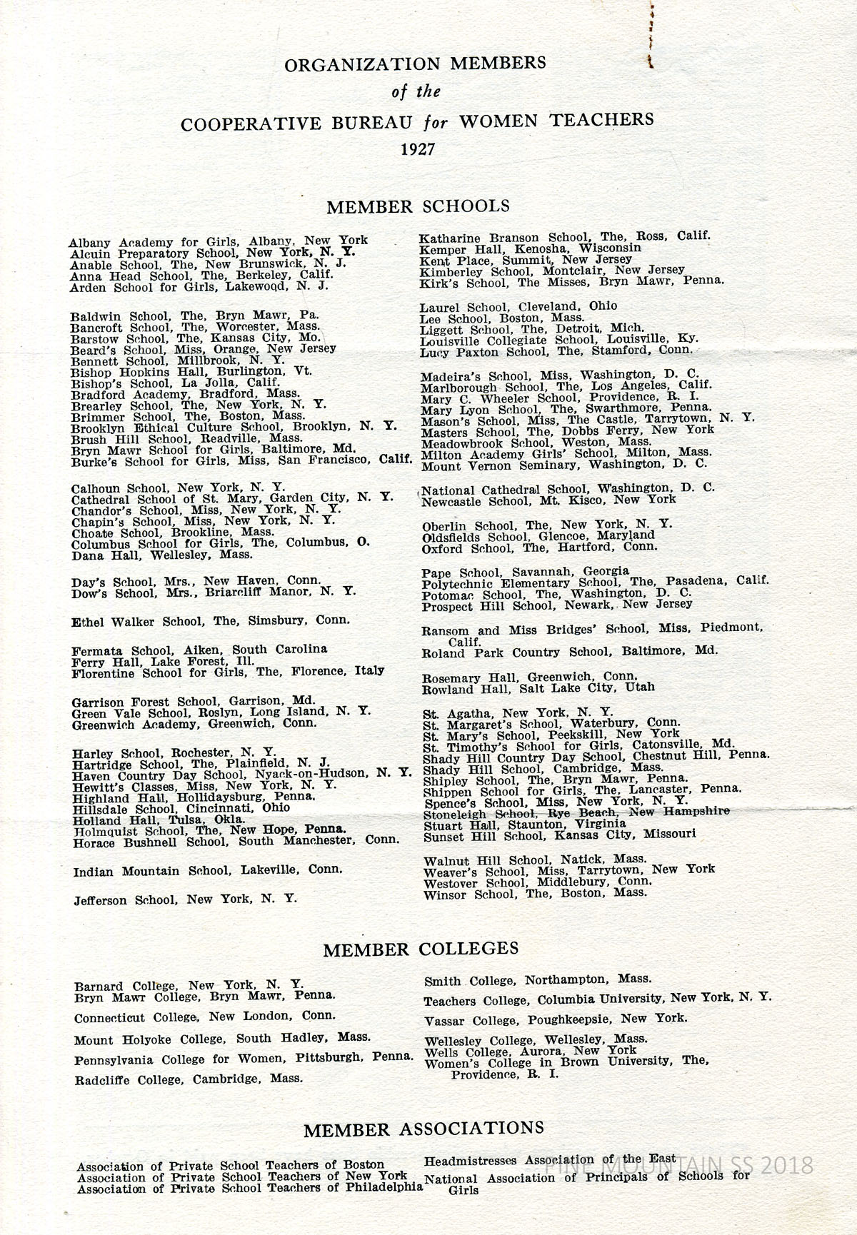 [melville_corr_036c.jpg] Printed list of “Organization Members of the Cooperative Bureau for Women Teachers, 1927,” including member schools, colleges and associations (4 pages).