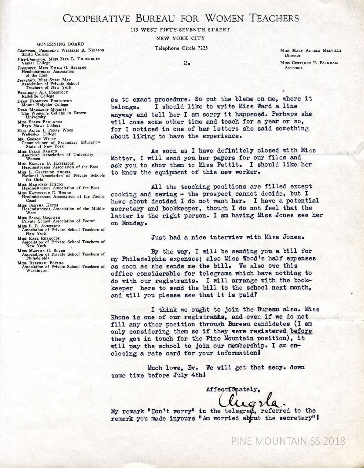 [melville_corr_007.jpg] Unsigned to Melville at the Cooperative Bureau for Women Teachers, NYC, July 26, 1926. Met Miss Jones and hopes she likes PMSS and stays. Suggests that Jean [Angela Melville’s sister] could work in the Office next year. Asks Melville to send Credit Union material to her “socialist friends.”