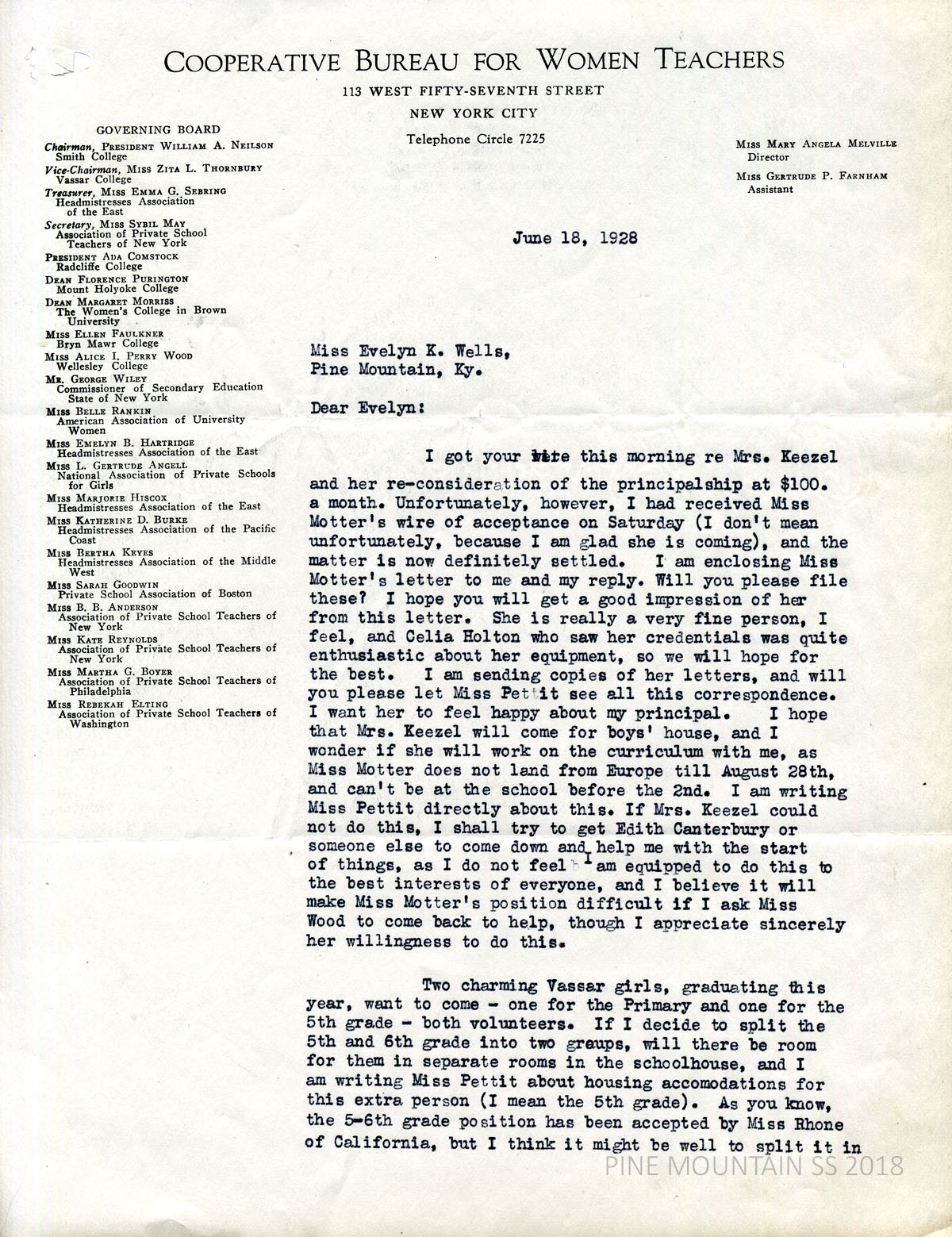 [melville_corr_040.jpg] and [melville_corr_040a.jpg] Melville to Wells, June 5, 1928, on letterhead for “Cooperative Bureau for Women Teachers,” NYC, 3 pages (typewritten original). Mrs. Keezel re-considered principalship at $100 a month, but Motter has already accepted. Sending Motter’s letters for Pettit’s review and filing. May ask Edith Canterbury or another to help with Motter’s starting days at PMSS. Has two Vassar girls willing to do volunteer teaching. (page 2) Discussed coordination of teachers, classrooms and subjects.