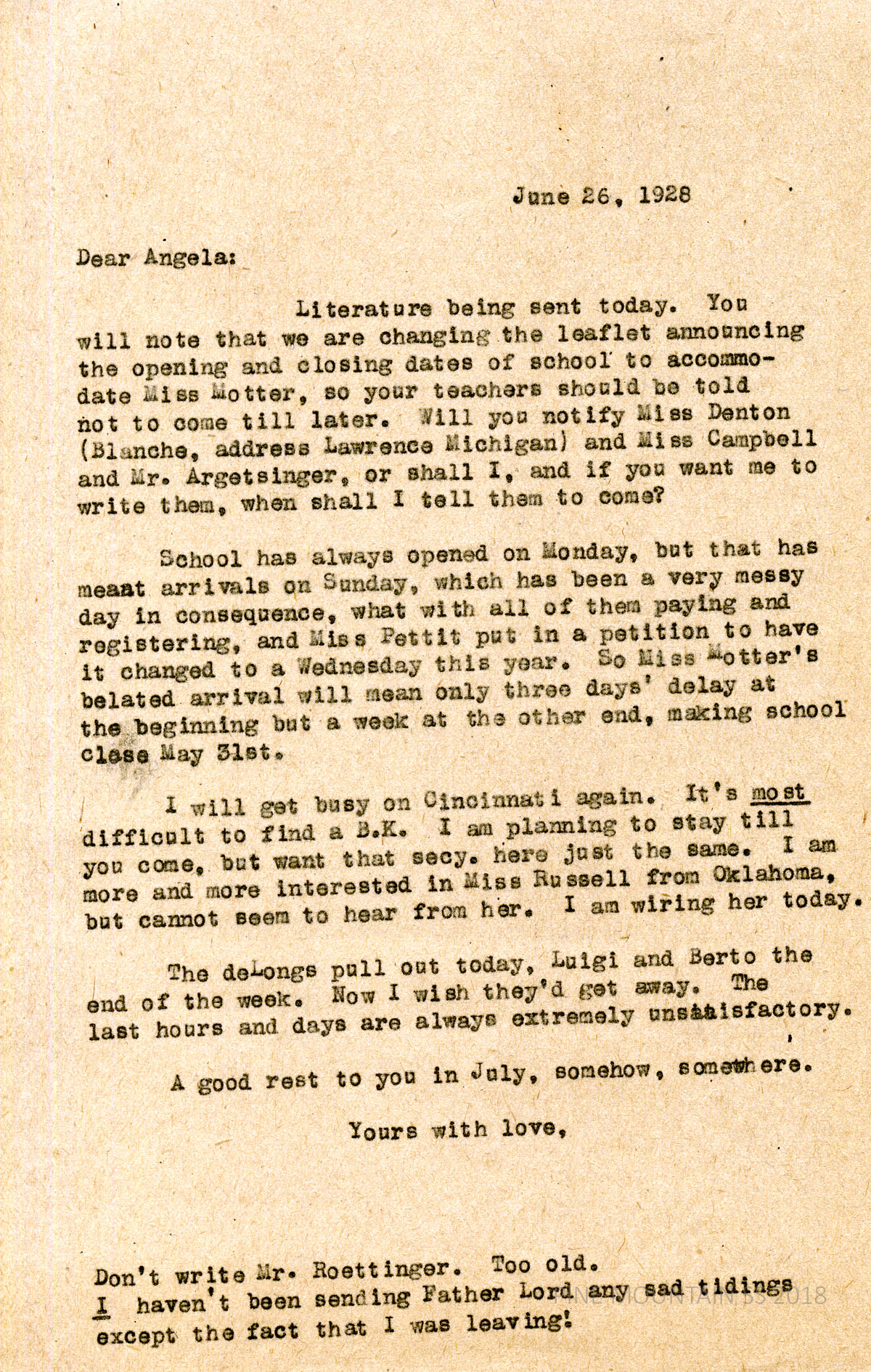 [melville_corr_046.jpg] Wells to Melville, June 26, 1928. Sending literature; asked Melville to inform teachers to come later to accommodate Motter’s arrival, including Miss (Blanche) Denton in Lawrence, Michigan, Miss Campbell and Mr. Argetsinger; discusses opening and closing schedule; will look for bookkeeper in Cincinnati.