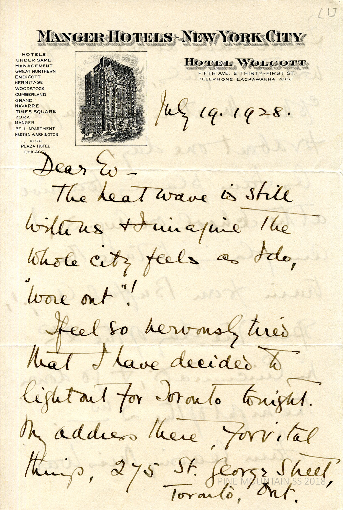 [melville_corr_047.jpg] Melville to Wells, July 19, 1928, handwritten on letterhead for Manger Hotels, NYC (Hotel Wolcott). Heat wave in the city, so “have decided to light out for Toronto tonight” and provides an address.