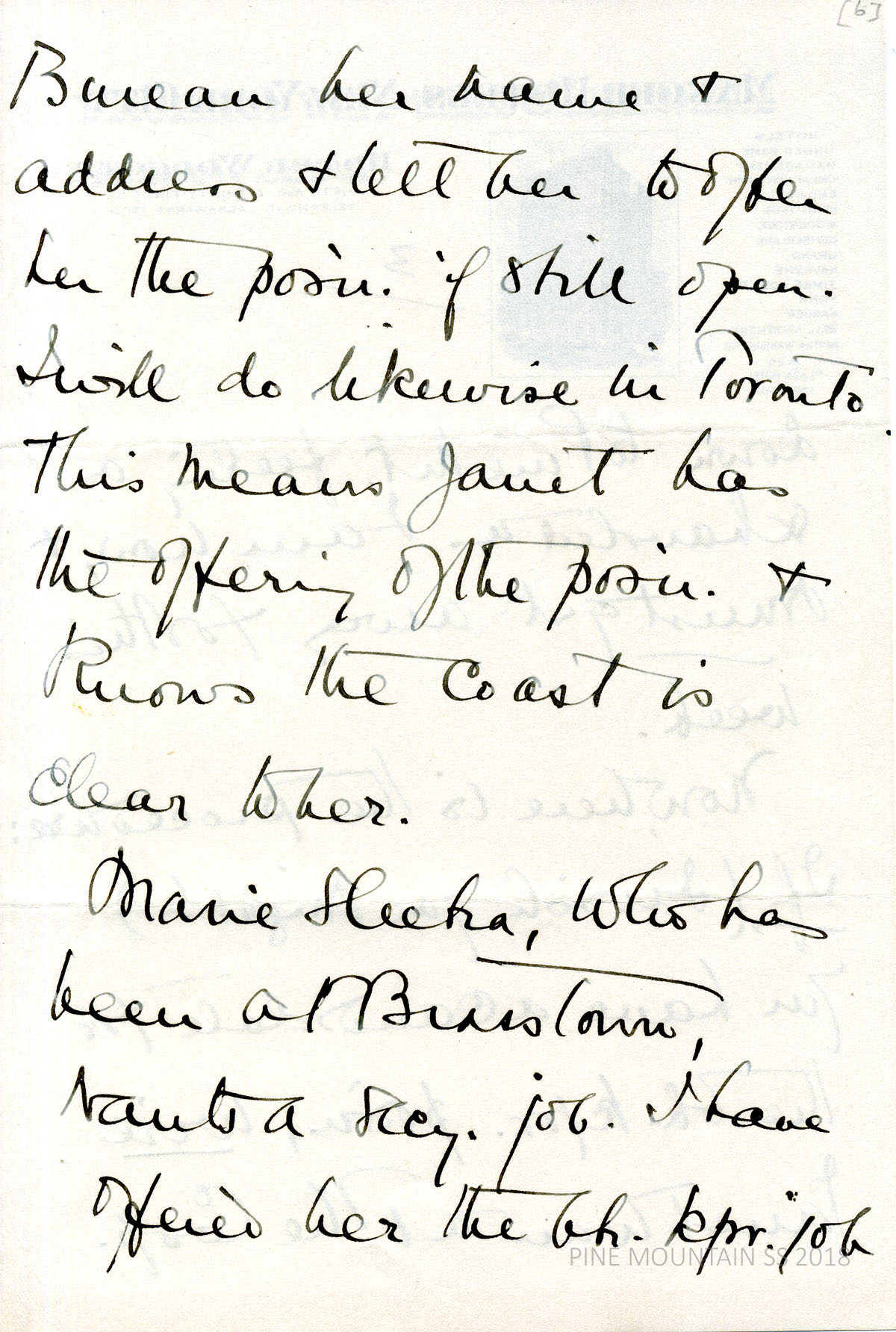 (048b, page 4) Describes other arrangements at the Bureau after she is gone; going to Toronto to rest.