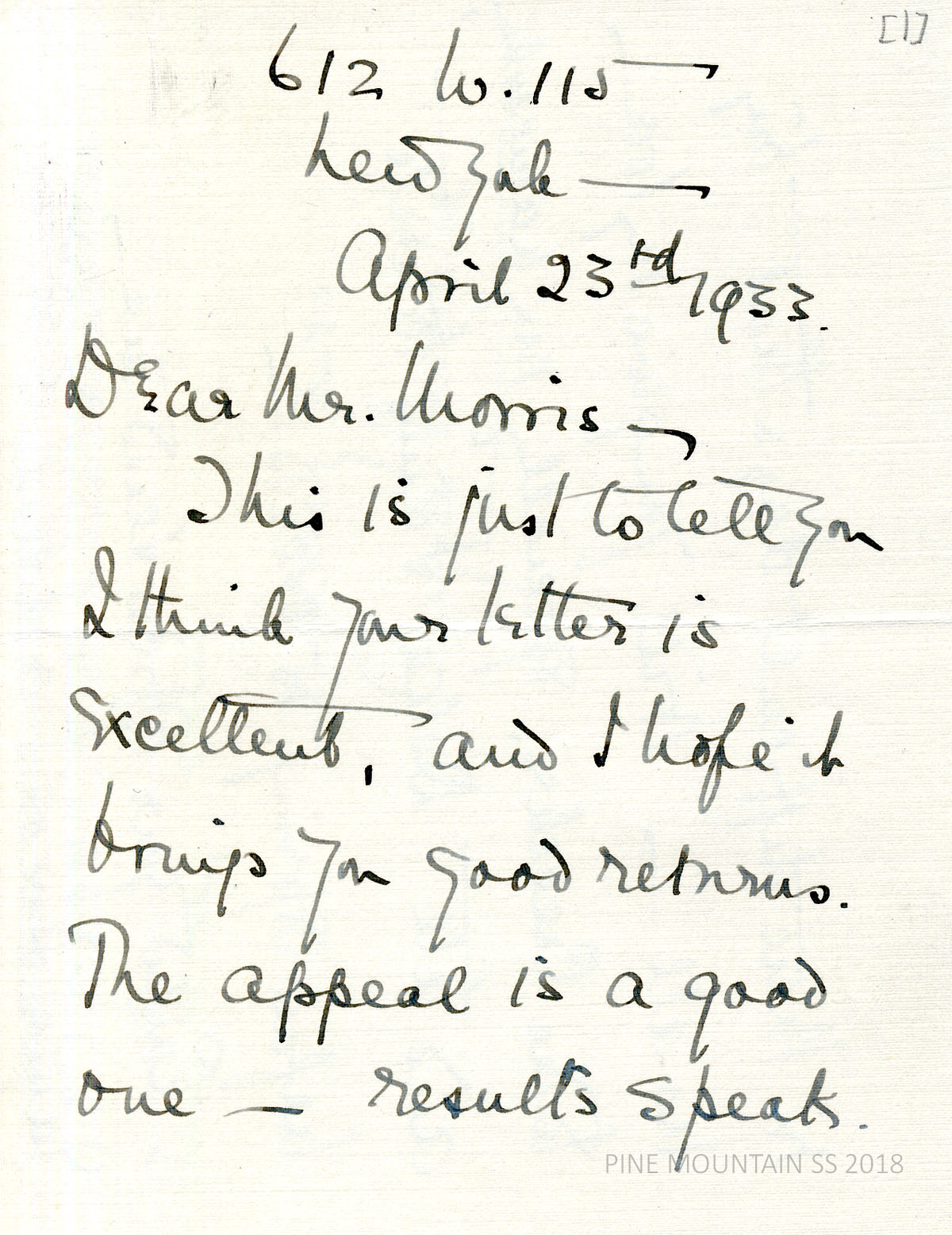 [melville_corr_080.jpg], [melville_corr_080a.jpg] and [melville_corr_080b.jpg] Original 3-page handwritten letter from Melville in NYC to Morris, April 23, 1933. (page 1) Assures Morris his appeal letter was excellent. (page 2) Encloses “a wee $1.00.” (page 3) “Will you give my love to the Creeches, specially my namesake, and tell Delia I aim to write…” Asked for the address for James Dixon.