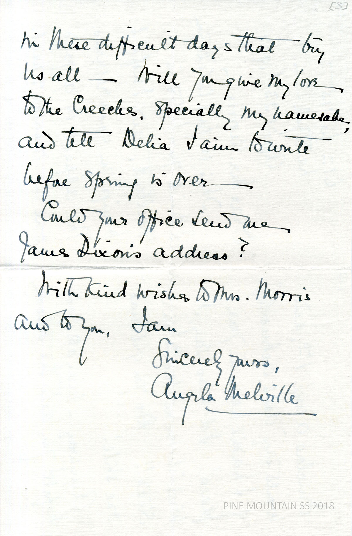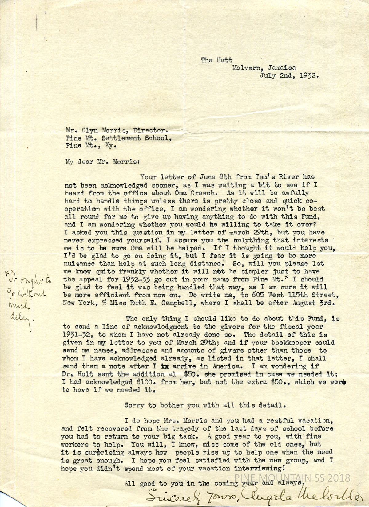[melville_corr_075.jpg] Morris to Melville at The Hutt, Malvern, Jamaica, July 2, 1932. Asks if Morris would take over the (Oma Creech) Fund from her, due to her living at a long distance. Melville only hopes that Oma Creech “will be helped.” Asks if the appeal for 1932-33 would go out in Morris’s name from Pine Mt. Provides NYC address. Discusses sending acknowledgments to 1931-32 donors who have not yet received them.