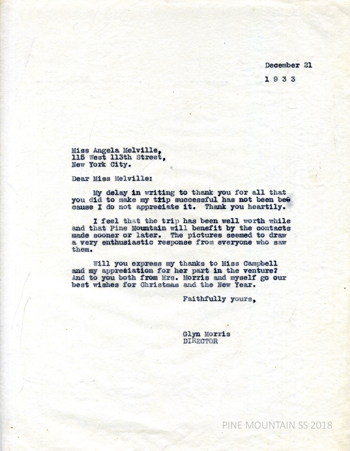 [melville_corr_082.jpg] Morris to Melville in NYC, December 31, 1933. Thanked Melville for “all that you did to make my trip successful….”; the trip was worthwhile due to the contacts Morris made; expressed thanks to Miss Campbell for her part.