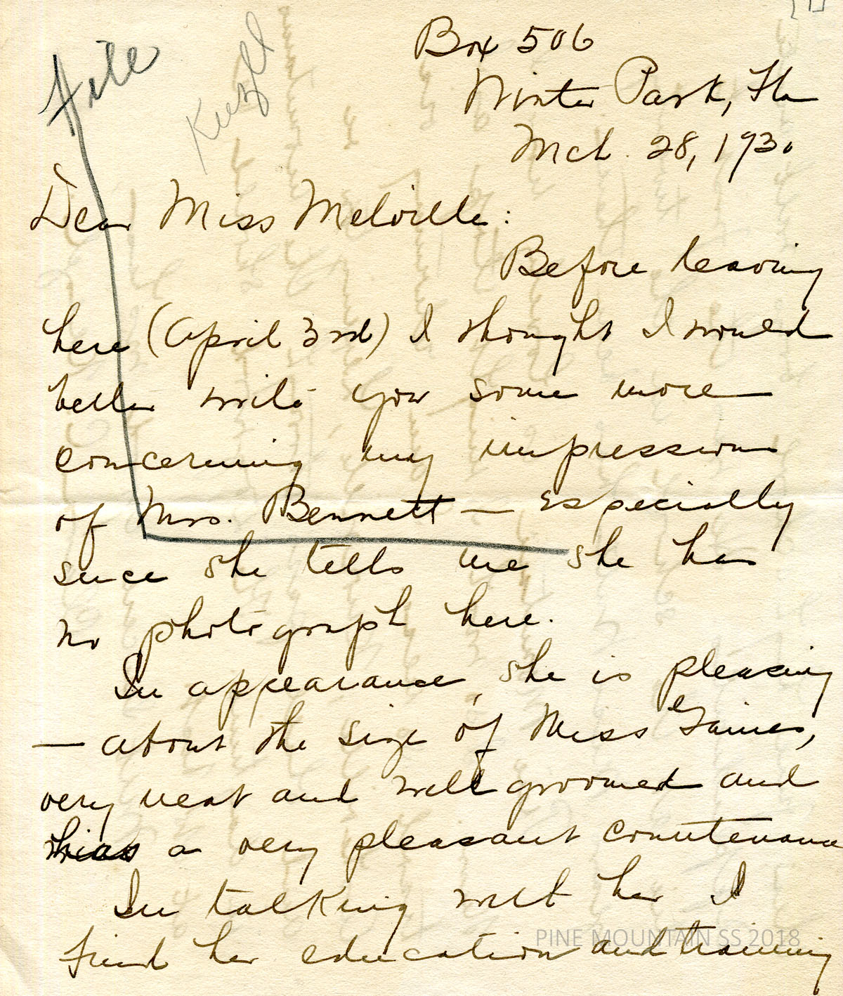 [melville_corr_055.jpg], [melville_corr_055b.jpg] and [melville_corr_055b.jpg] Original handwritten 3-page letter to Angela Melville from Clara C. Keezel at Winter Park, FL, March 28, 1930. (page 1) Impressions of Mrs. Bennett. (page 2) Asked about Melville’s plans for the Knoxville Conference. Miss Watts (?) and Miss Stone will attend. (page 3) They lost a student to appendicitis at Hindman. Keezel may visit PMSS.