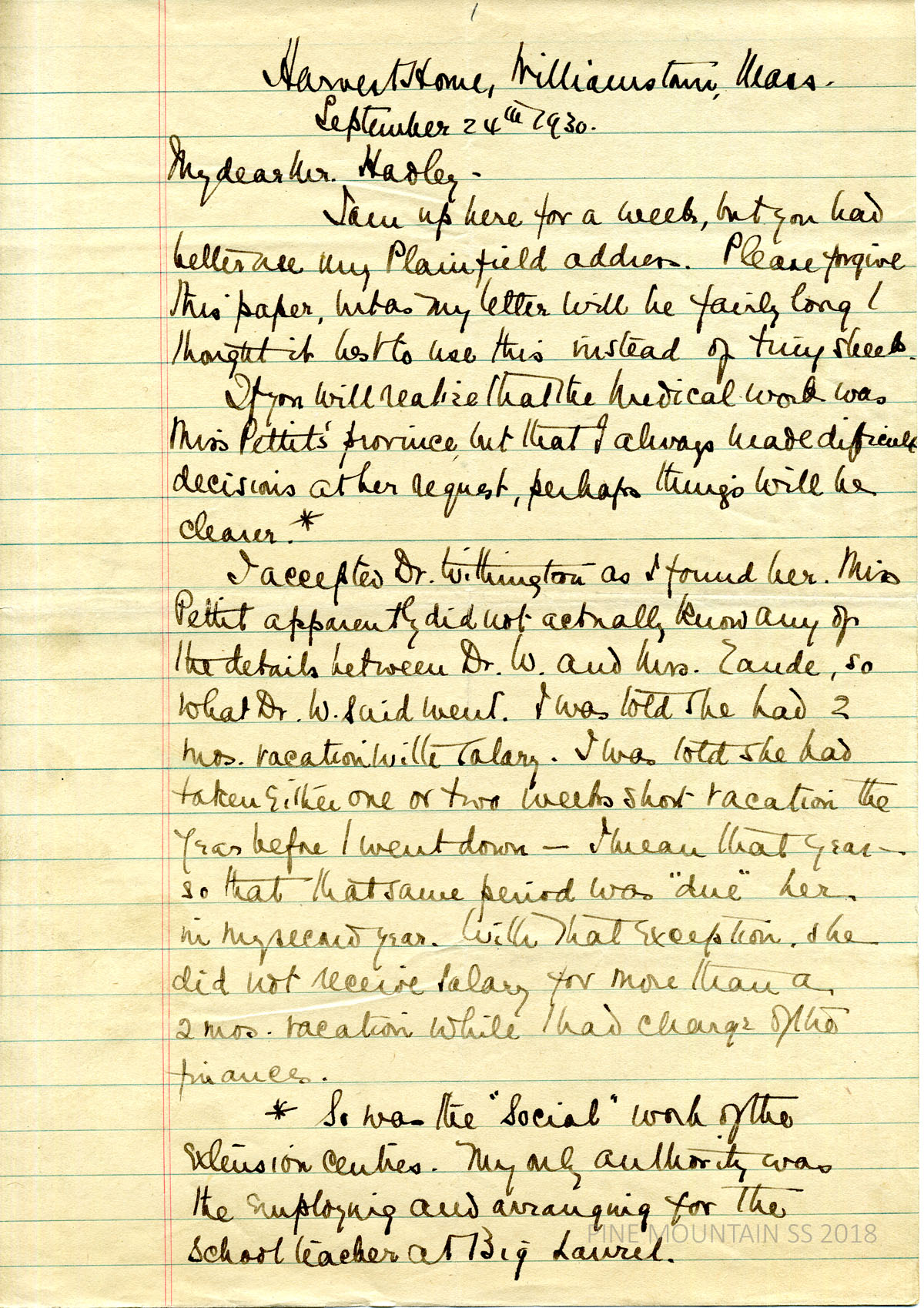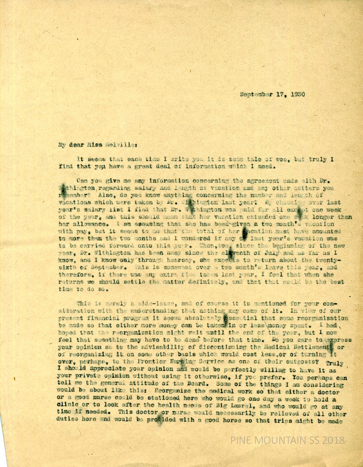 [melville_corr_056.jpg] and [melville_corr_056a.jpg] Hubert Hadley, PMSS Director, to Melville in Plainfield, NY, September 17, 1930. Asked for information concerning the agreement made with Dr. [Alfreda] Withington, regarding salary, vacations, etc., in order to calculate her vacation versus her salary. PMSS’s financial program needs to be reorganized concerning income and expenses; asked for Melville’s opinion about discontinuing the [Big Laurel] Medical Settlement, reorganizing it so it will cost less or turning it over to Frontier Nursing Service; need to know general attitude of the Board. Suggests several ways to reorganize the Medical Settlement. (page 2) Getting bids for a heating plan for Zande House.