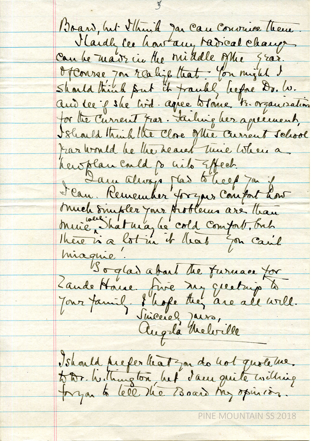 [melville_corr_057c.jpg] (page 3) Gives her opinions about the future of Big Laurel Medical Center: “we have the investment in property there and before giving it up two things should be considered:” (a) Hire a married couple (nurse & teacher) or a lone teacher (b) “or an amalgamation with Mrs. Breckenridge’s work.” States problems with leaving the house empty or having one teacher live there alone.