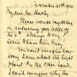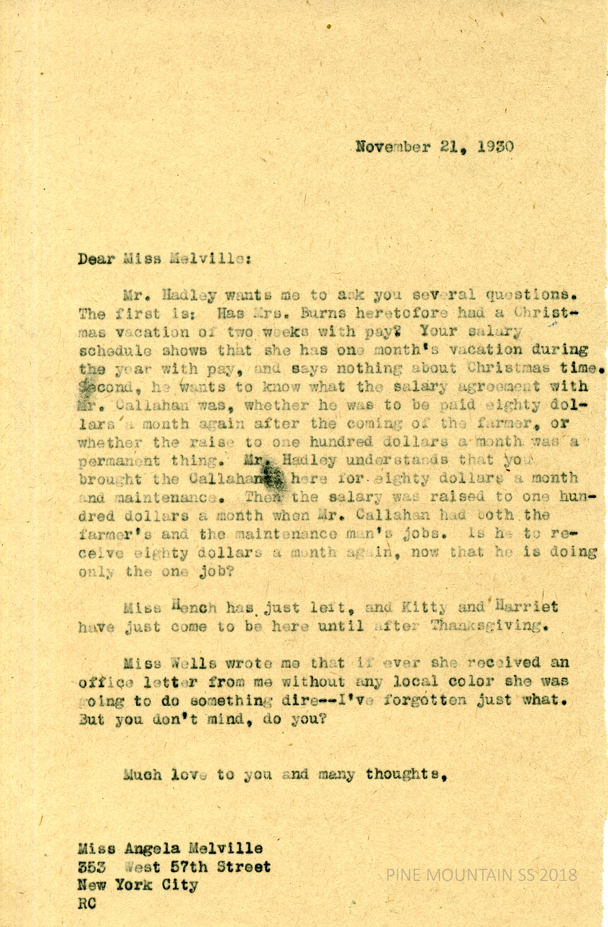 [melville_corr_059.jpg] Unsigned to Melville in NYC, November 21, 1930. Relays questions from Mr. Hadley: Mrs. Burns Christmas vacation history; salary agreement with Mr. [Boone] Callahan “with the coming of the farmer.” Updates: Miss [Elizabeth] Hench has left; Kitty and Harriet are visiting.