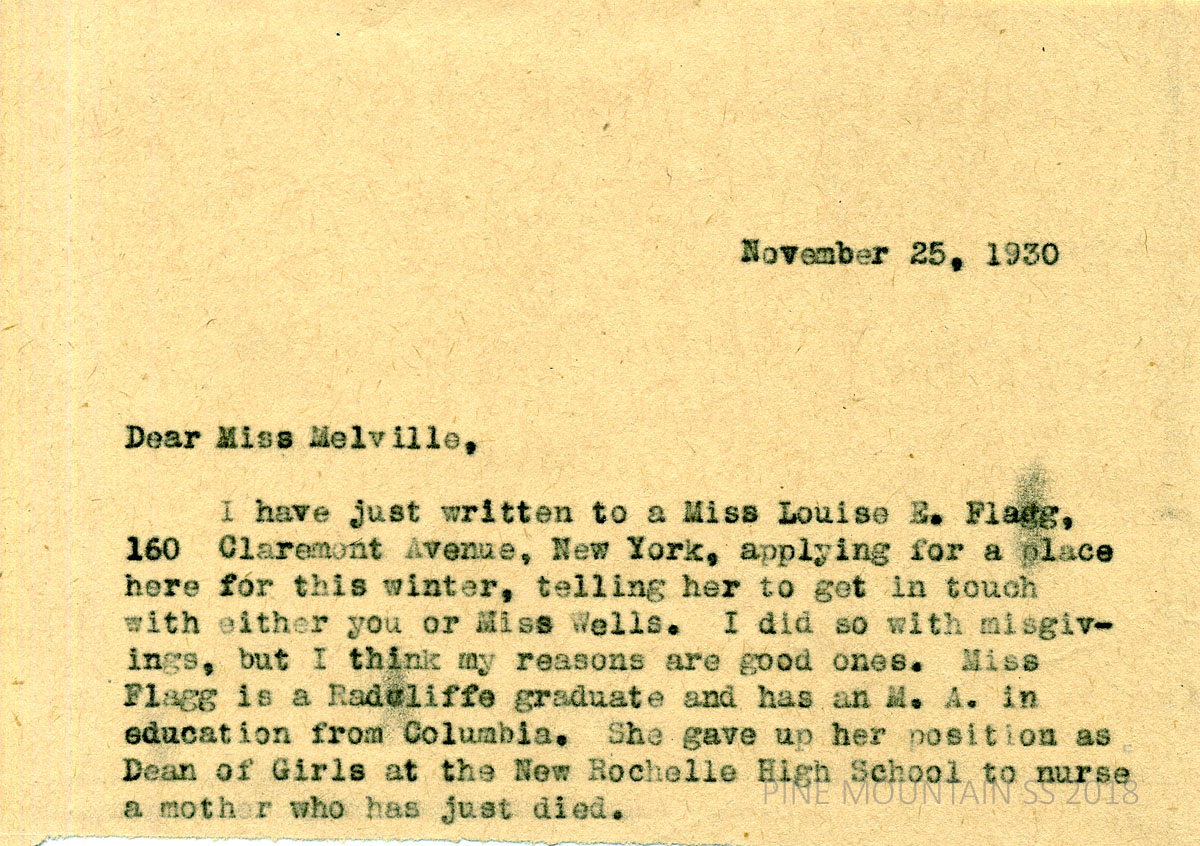 [melville_corr_061.jpg] Unsigned (truncated letter) to Melville, November 25, 1930. Wrote to Miss Louise E. Flagg in NYC “applying for a place here for this winter”; describes her credentials.