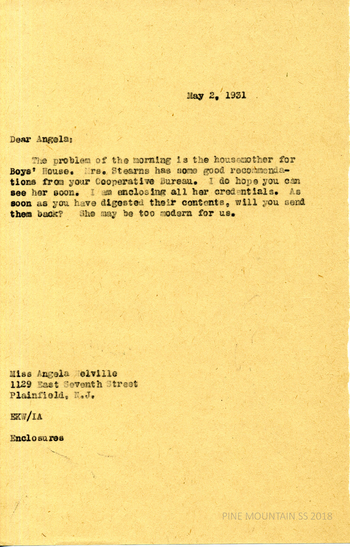 [melville_corr_064.jpg] Wells to Melville in Plainfield, NJ, May 2, 1931. Enclosing credentials for Mrs. Stearns, who is applying for Boys’ House housemother. “She may be too modern for us.”
