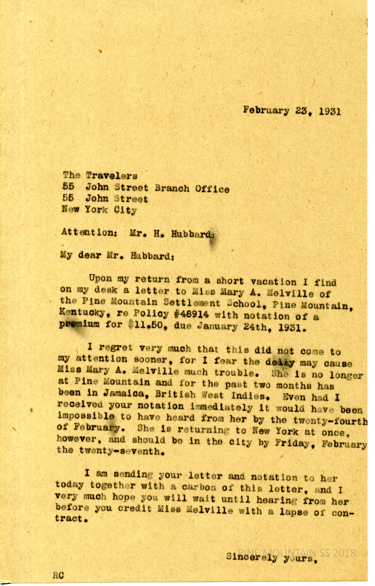[melville_corr_065.jpg] Unsigned to Mr. H. Hubbard at The Travelers, NYC. Explains the delay in forwarding Hubbard’s letter to Melville, who was in Jamaica for 2 months; asks him to wait until hearing from her before crediting her with a lapse in her insurance contract.