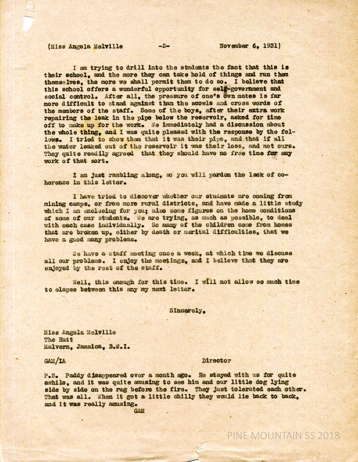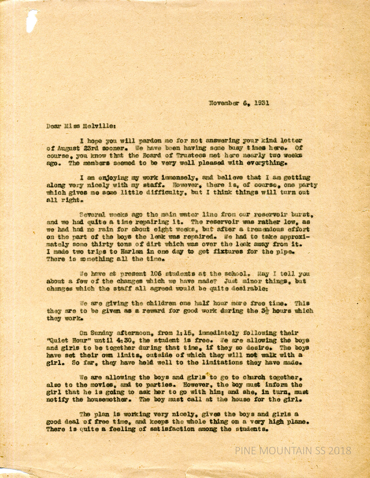 [melville_corr_069.jpg] and [melville_corr_070.jpg] Unsigned to Melville, November 6, 1931. (page 1) School updates: Board is pleased with everything; I’m enjoying my work immensely and believe that I am getting along very nicely with my staff”; describes the repairs to the reservoir which had a broken main water line; now have 106 students. Describes small changes at the School: the children get an extra 1/2 hour free time for 3 1/2 hours of good work; interactions that are permitted between boys and girls.