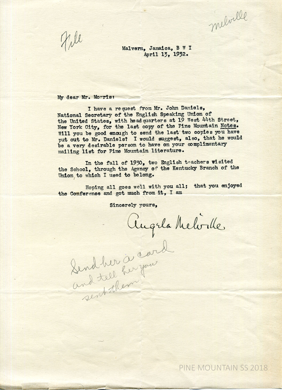 [melville_corr_073.jpg] Melville to Morris in Malvern, Jamaica, April 13, 1932 (original typewritten letter). Asks for copies of the Notes to be sent to John Daniels, Nat’l Secretary of the English Speaking Union of the U.S. Two of their English teachers visited the School in fall 1930.
