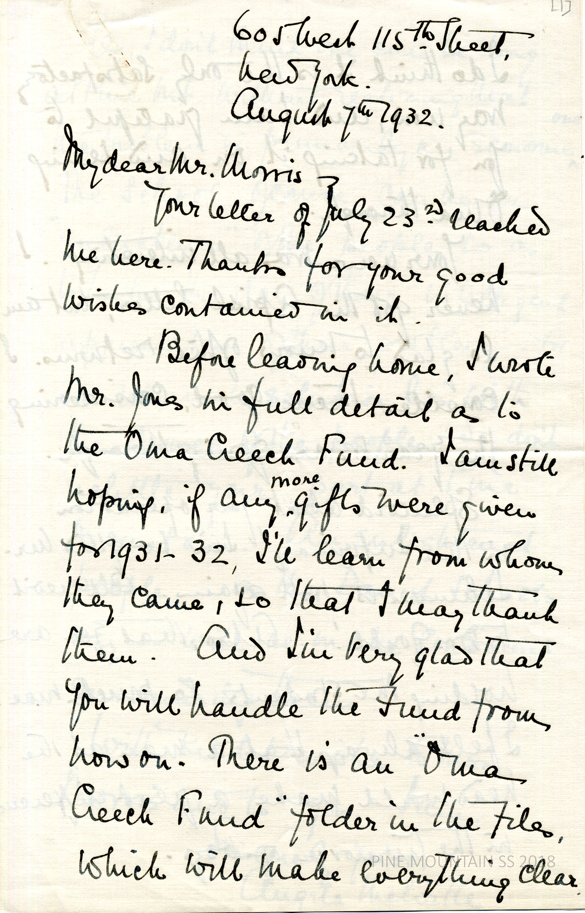 [melville_corr_077.jpg] Original 2-page handwritten letter from Melville in NYC to Morris, August 7, 1932. (page 1) Has written to Mr. Jones about the Oma Creech Fund.