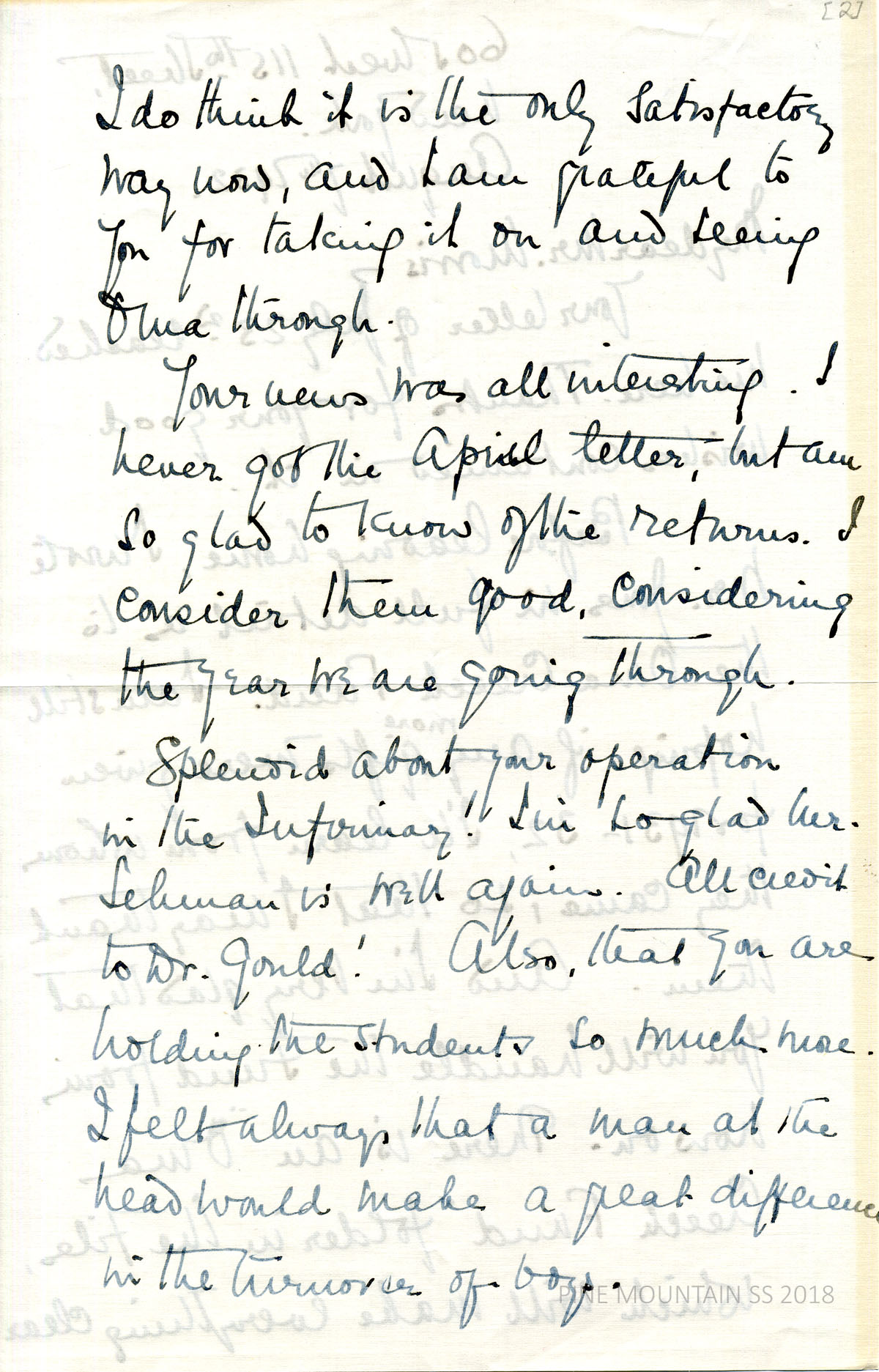 (page 2) First major operation in the Infirmary was on the PMSS secretary, Mr. Lehman (“brother of Lehman of Red-Bird, a college chum of mine”) for appendicitis; performed by Dr. [Kenneth N.] Gould. Considering purchasing a silo and grow corn to save of the annual feed bill. Increase of 25% more students this year; fell $800 short of amount received from the April Letter of the preceding year. Building a 3-foot wall on the reservoir to increase water supply. Discusses the “tragedy of May Day,” why he thinks it occurred and possible solutions.