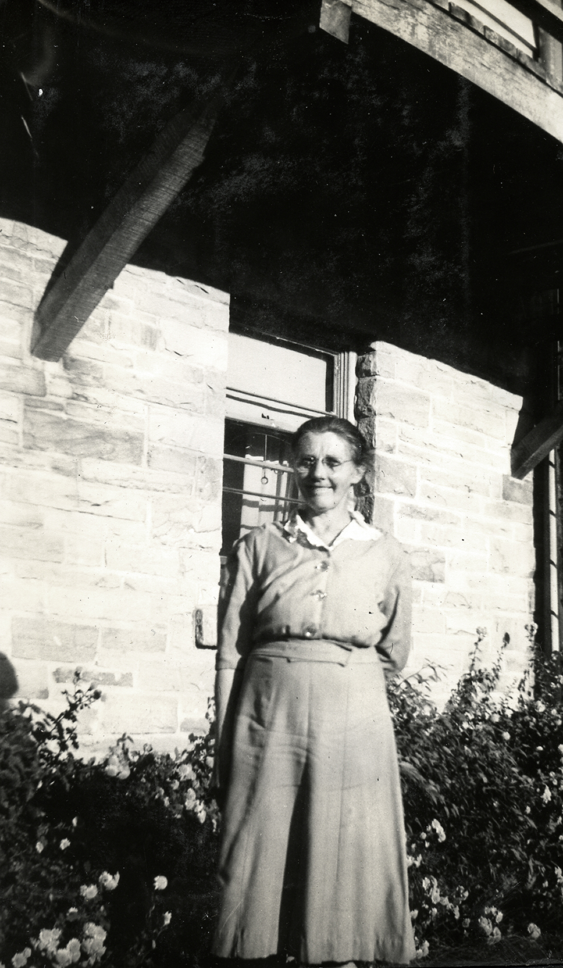 - Aileene Lewis standing on steps of the Office at Pine Mountain [damaged photograph] [nesb_040_mod.jpg]