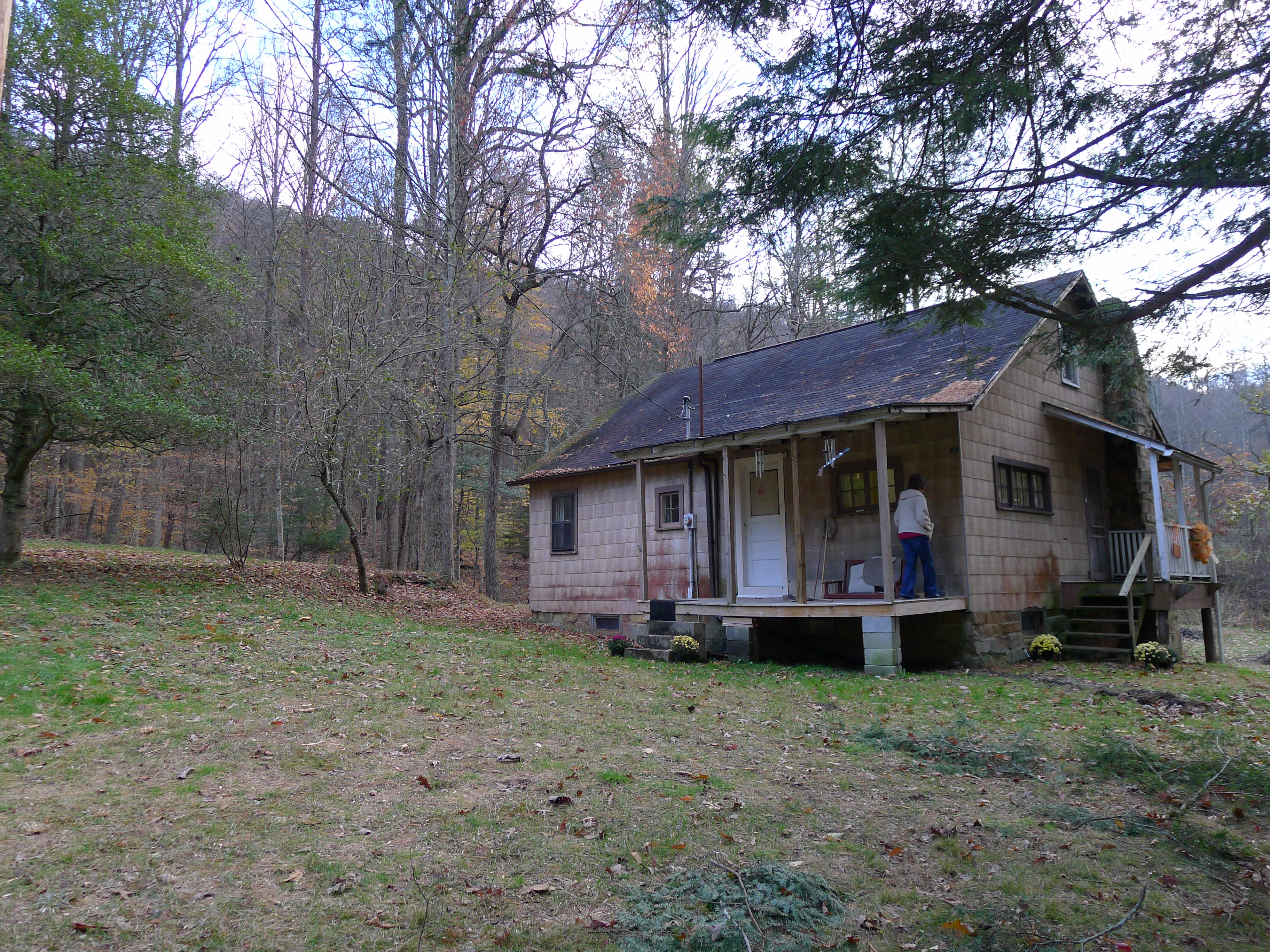 - Creech Cottage. Raking view from road to Cottage. Judy Lewis standing on porch. [P1060564.jpg]