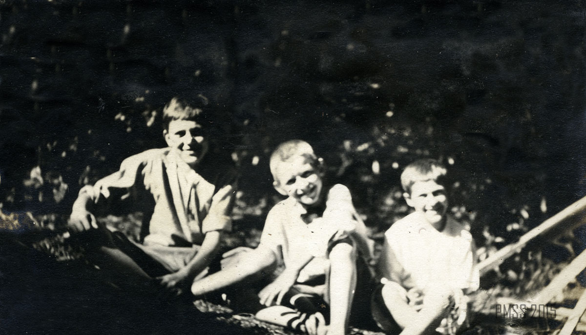 - 025b P. Roettinger Album. “Dewie Lewis, John [Clyde] and Charlie.” [Three young boys sitting outside.] [roe_025b.jpg]