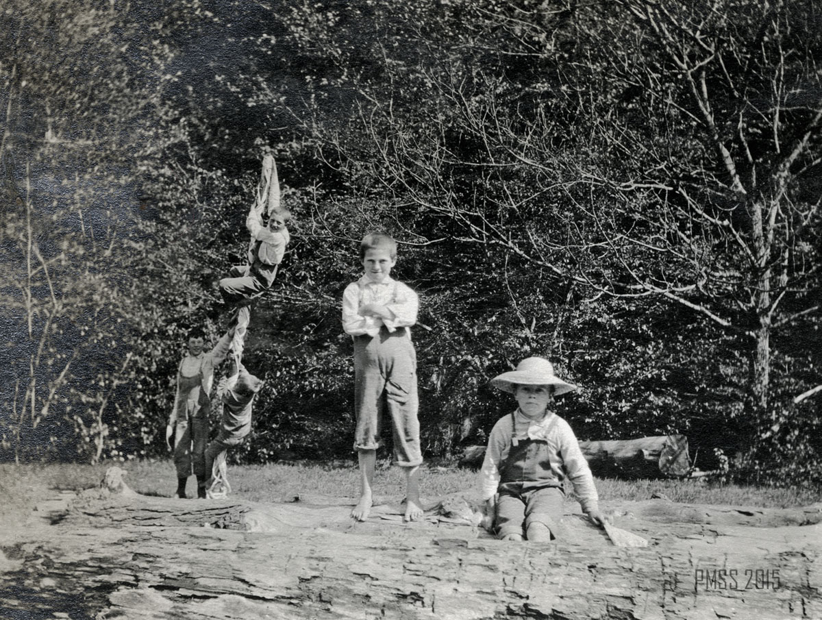 - 027a P. Roettinger Album. “The end of the May pole – Munroe, Charlie and the three Lewises.” [Five boys: Two in the foreground on large logs, one standing by a pole in the back, and two climbing on the pole.] [roe_027a.jpg]
