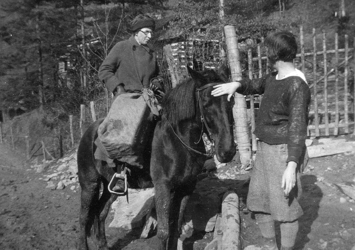 - Medical Settlement, Big Laurel. Worker seated on horse with Aileene Lewis, standing. [nesb_038_mod.jpg]