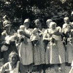 As part of preparing for displays for the 1949 Community Fair Day, three PMSS workers took a walk through the community to gather unique “antiques” and promote the fair. One of the workers wrote about the people they met, such as Mrs. Marsh Browning “drying apples over a slow fire in the yard by the creek.” They also encountered Mrs. Jim Browning [Mattie Browning] and all her children on the front porch. “Jim is the local lay preacher, a really good and hardworking man, with a knowledge of scripture that’s amazing.” 1949 COMMUNITY FAIR DAY.