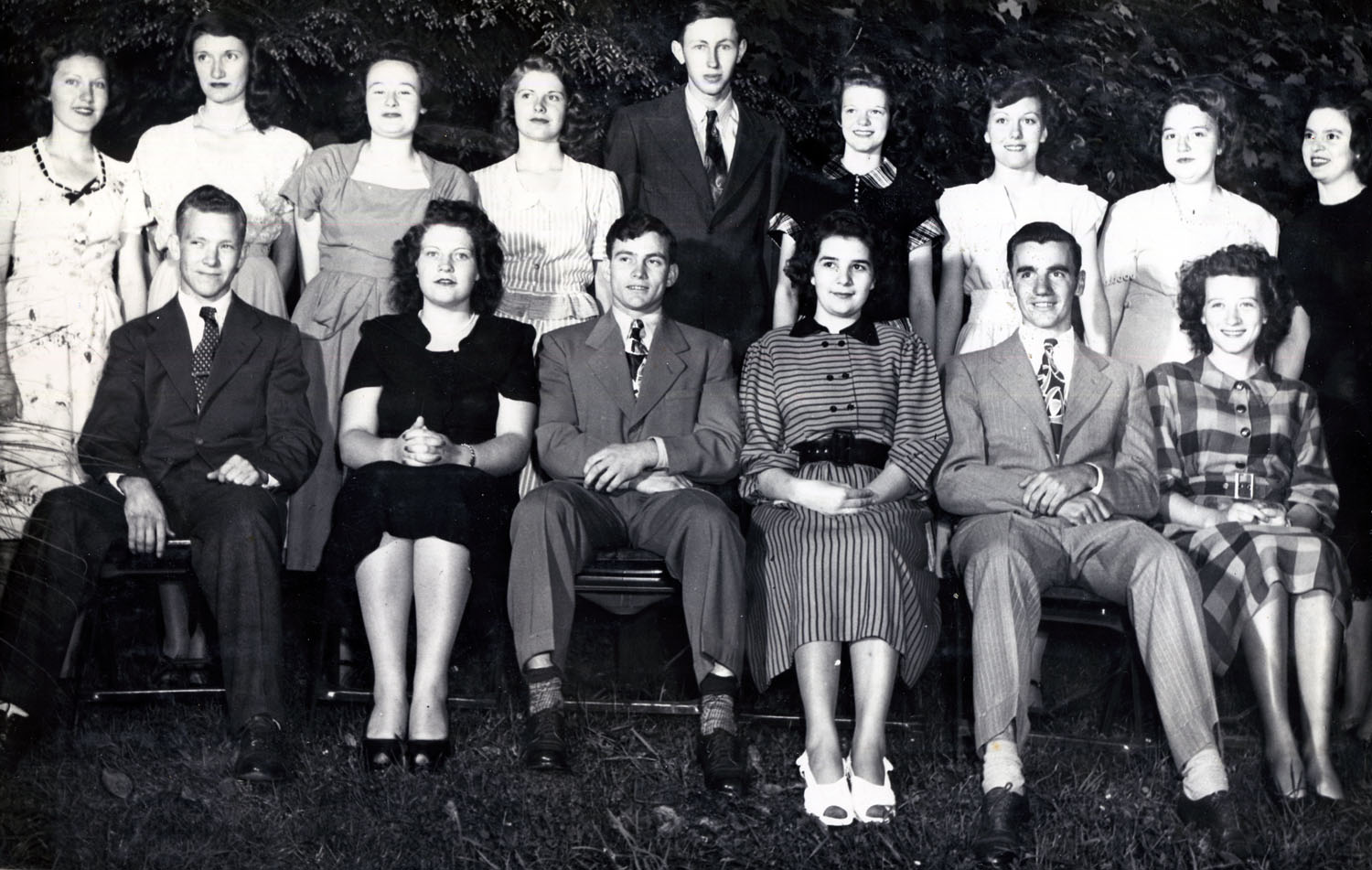 - “Seniors 1948.” [Back row] Jane Burkhart, Ida MacLewis, Charleen Lewis, Margaret Blair, Raymond Sturgill, Mary Ruth Bird, Betty Huff, Ann Metcalf, Alberta Turner. [Front row] Melvin Coots, Mary Garrett, Hobart Wilder, Clella Sergent, Owen Lewis, Birdie Tipton. [nace_II_album_100.jpg]