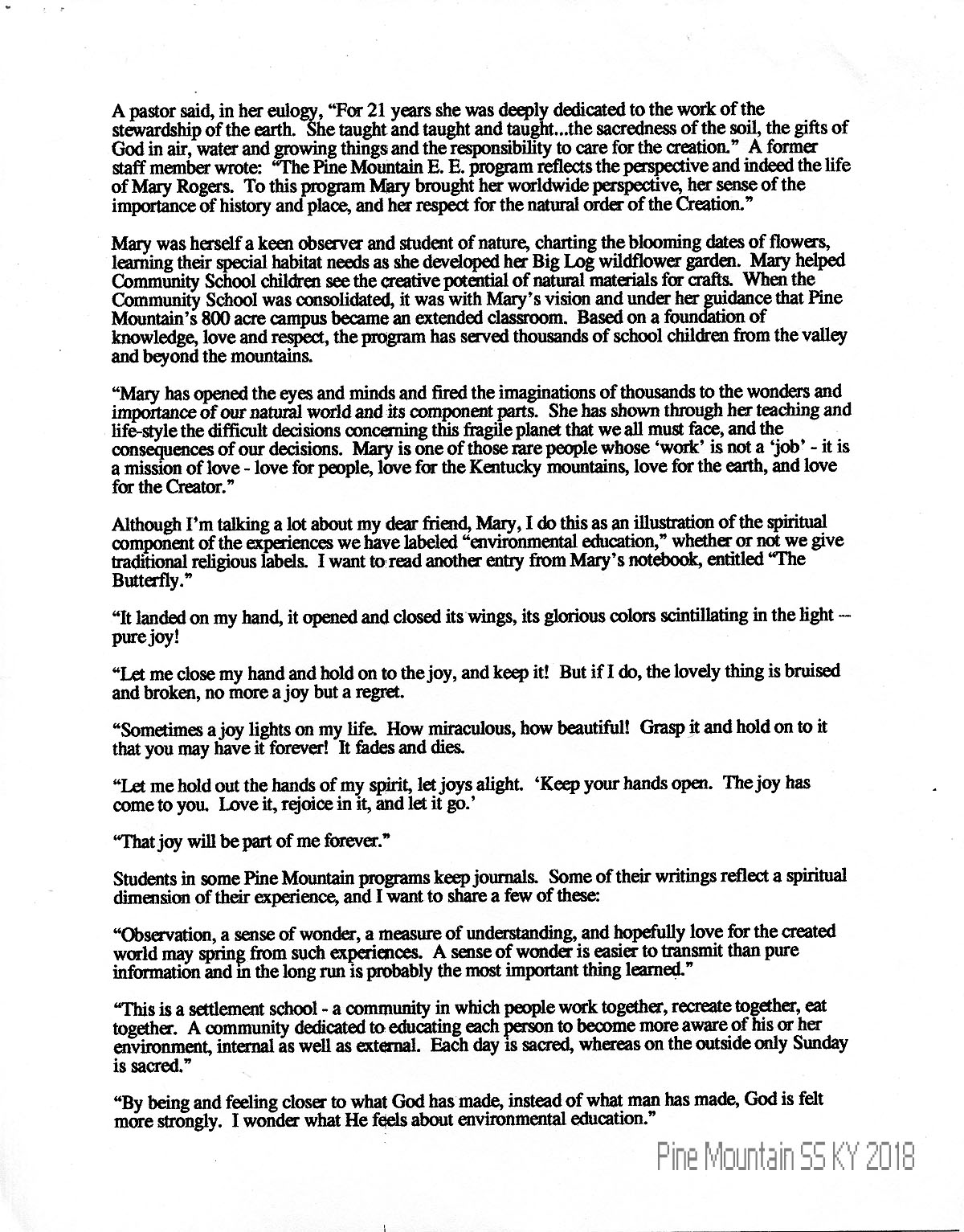 The touching tribute captures well the remarkable power of Mary’s message to visitors and to the many classes she taught in the program she founded, the Pine Mountain Environmental Education Program.