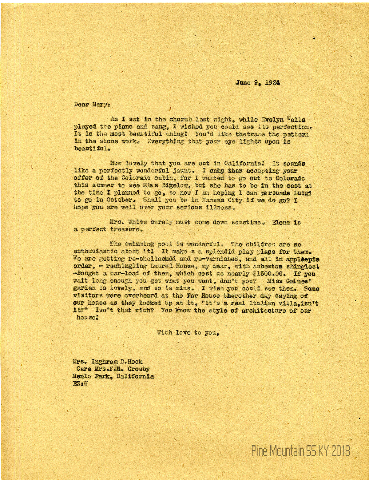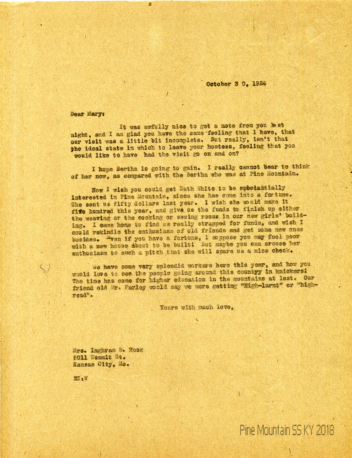 TAGS: Mary Rockwell Hook; correspondence; 1924; architecture; architects; Pine Mountain Settlement School; Harlan County, KY;