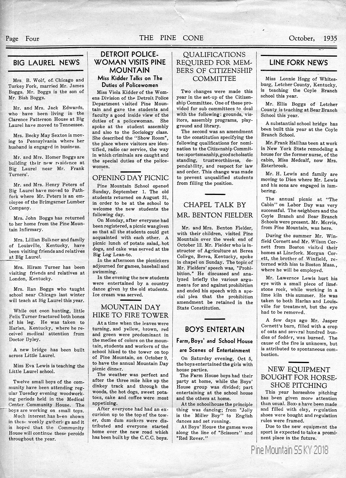 TAGS: The Pine Cone 1935 October, student writings, Tomfoolery, Halloween, editorials, Fair Day athletics, student activities, Big Laurel News, talks, Line Fork News