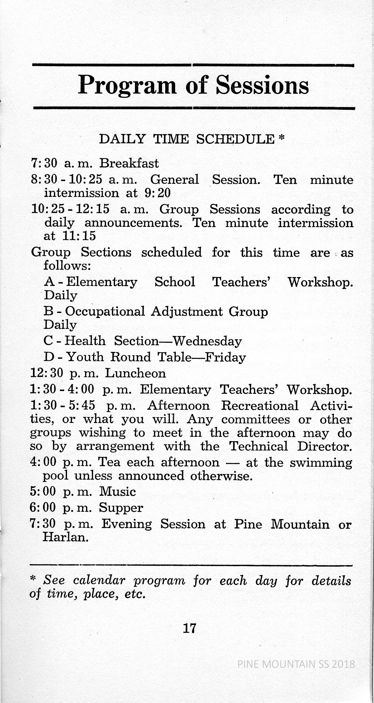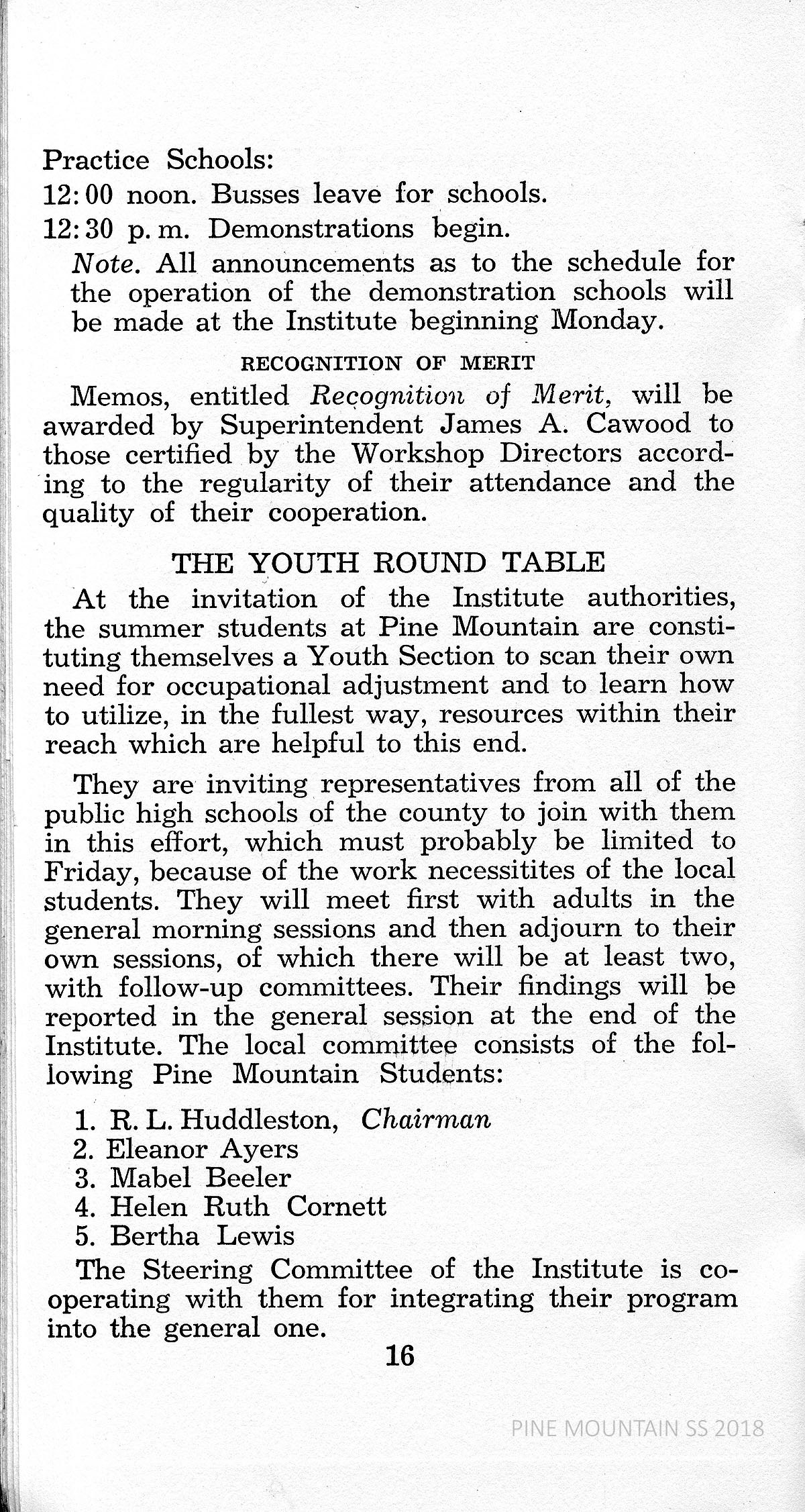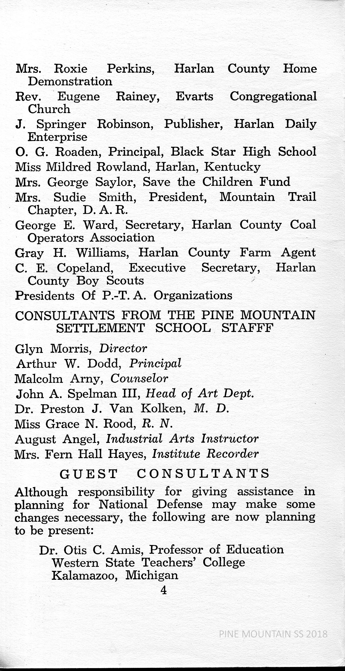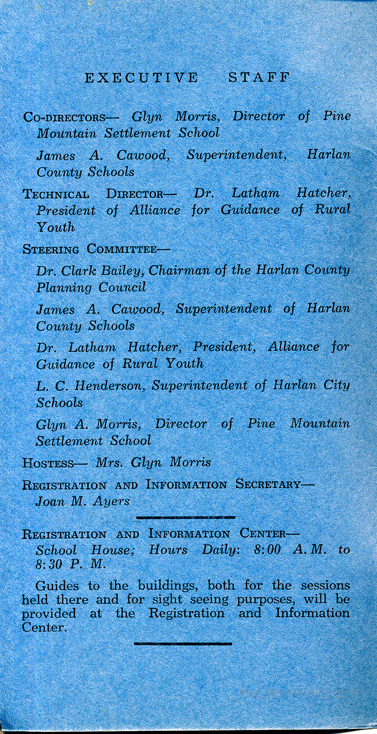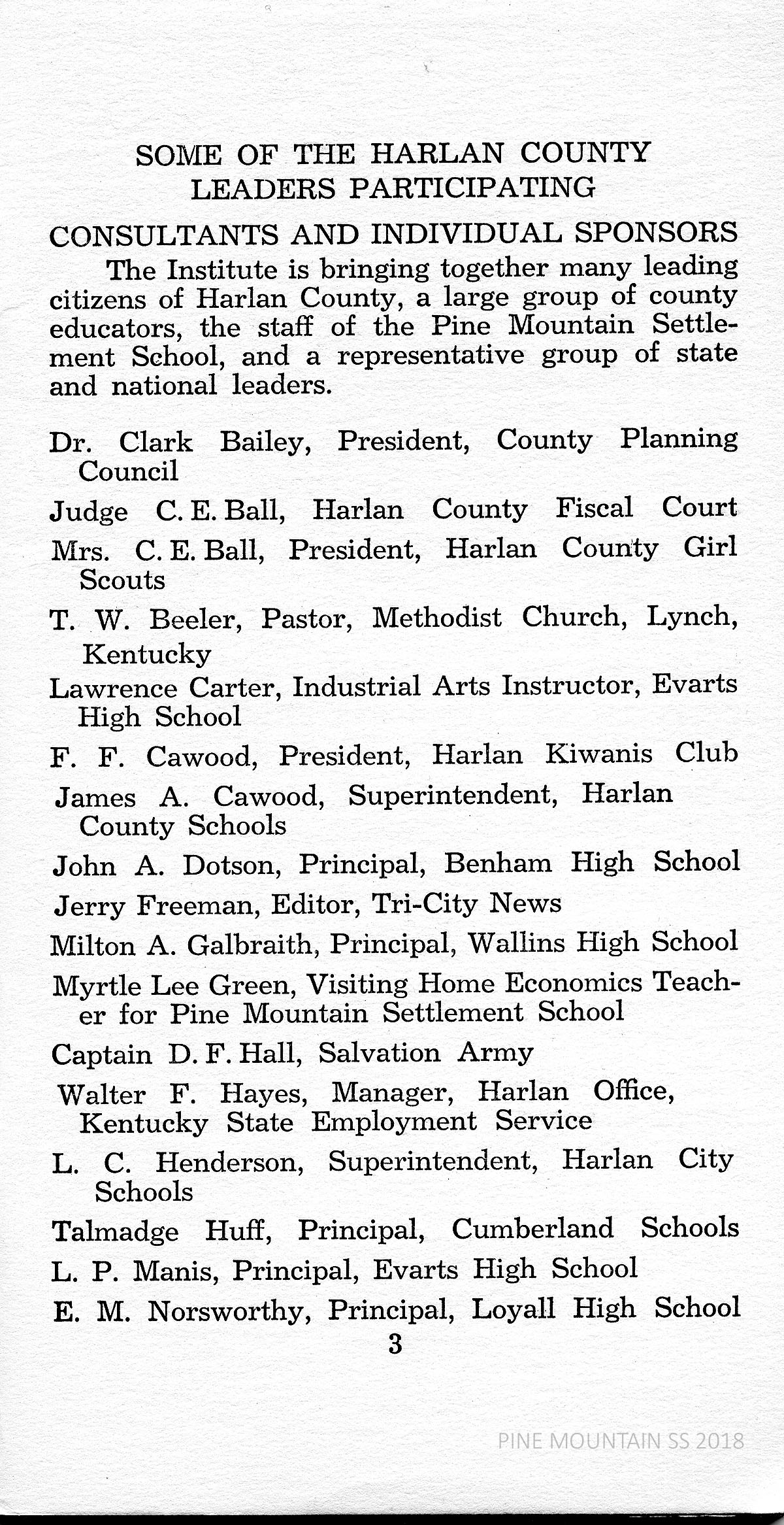 The 1940 PINE MOUNTAIN RURAL YOUTH GUIDANCE INSTITUTE was the fourth annual week-long meeting of Harlan County teachers, parents, ministers and other youth leaders. It was held at the Pine Mountain Settlement School where most of the earlier meetings had been located. The Alliance for Guidance of Rural Youth of Richmond, Virginia, sponsored the meeting.