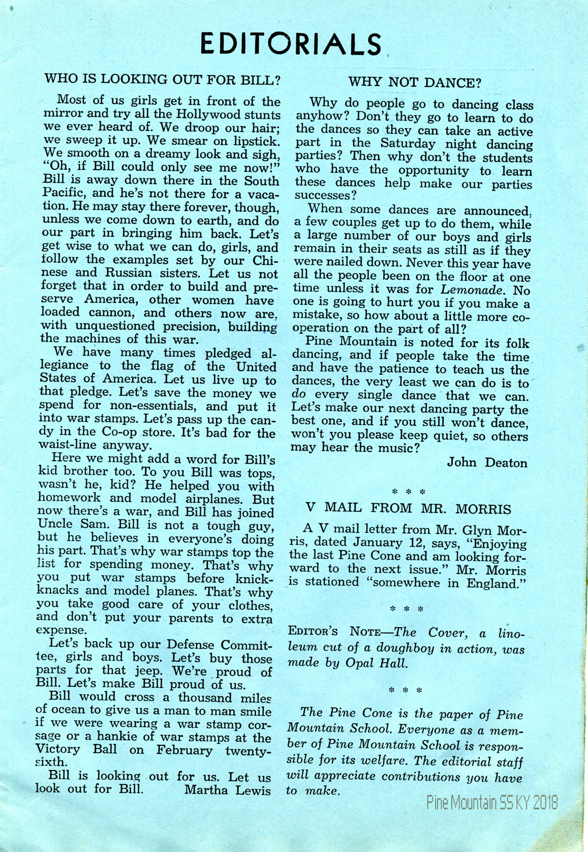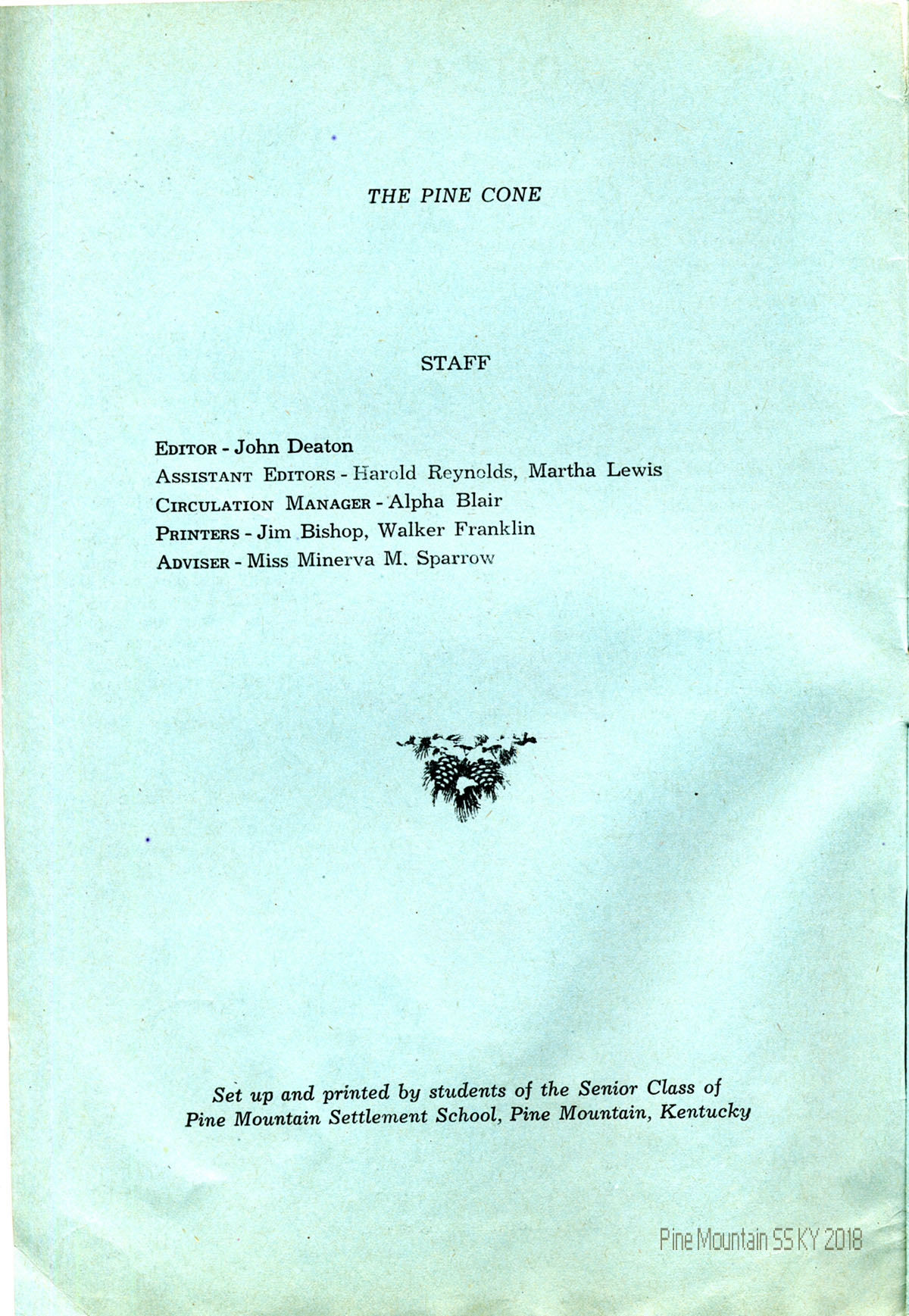 “The Pine Cone is the paper of Pine Mountain School. Everyone as a member of Pine Mountain School is responsible for its welfare. The editorial staff will appreciate contributions you have to make.”