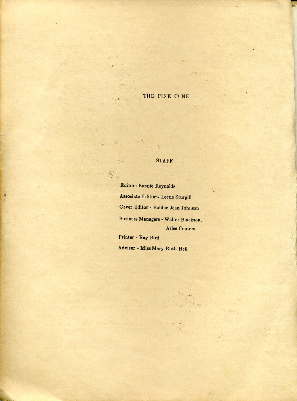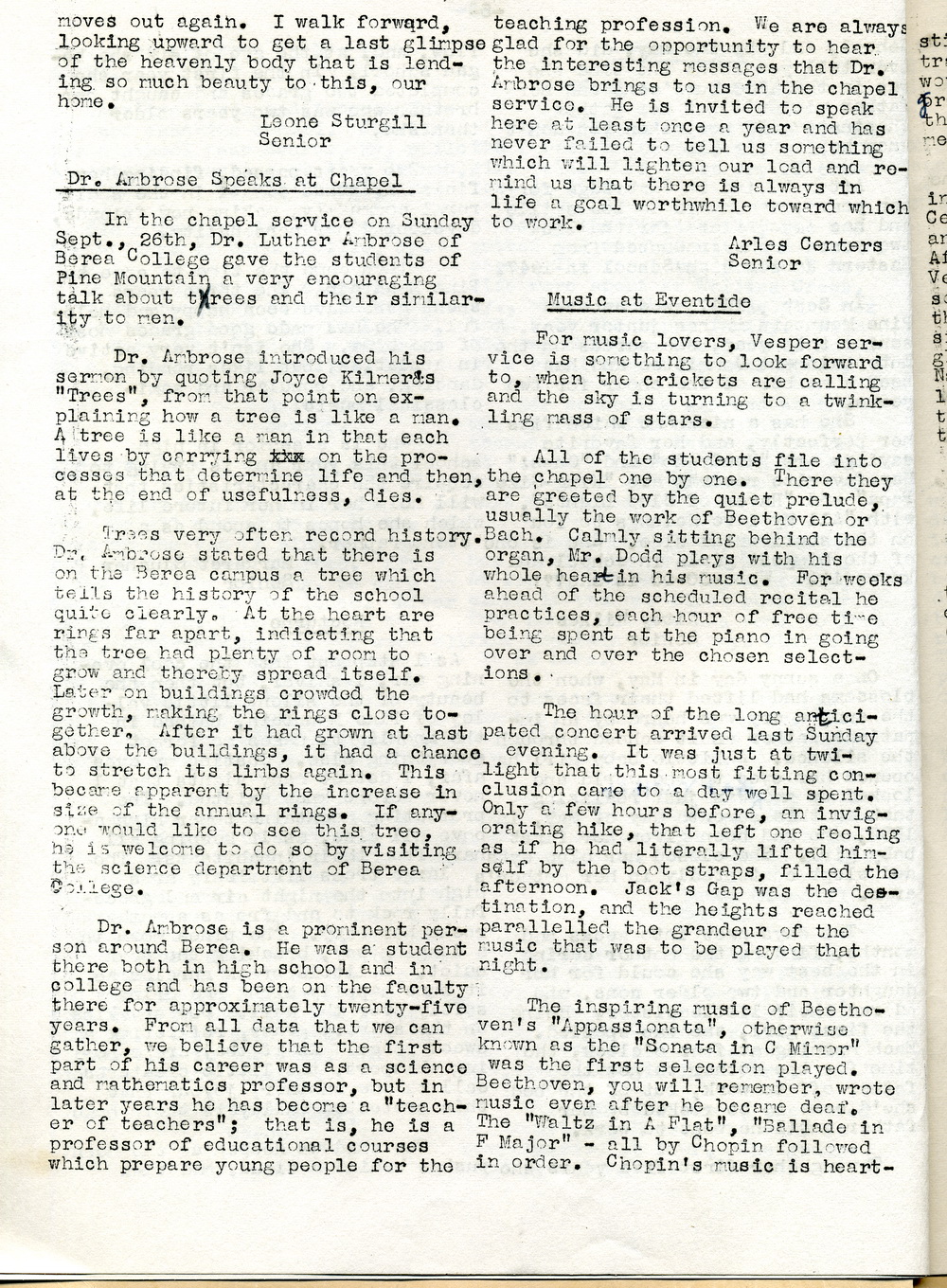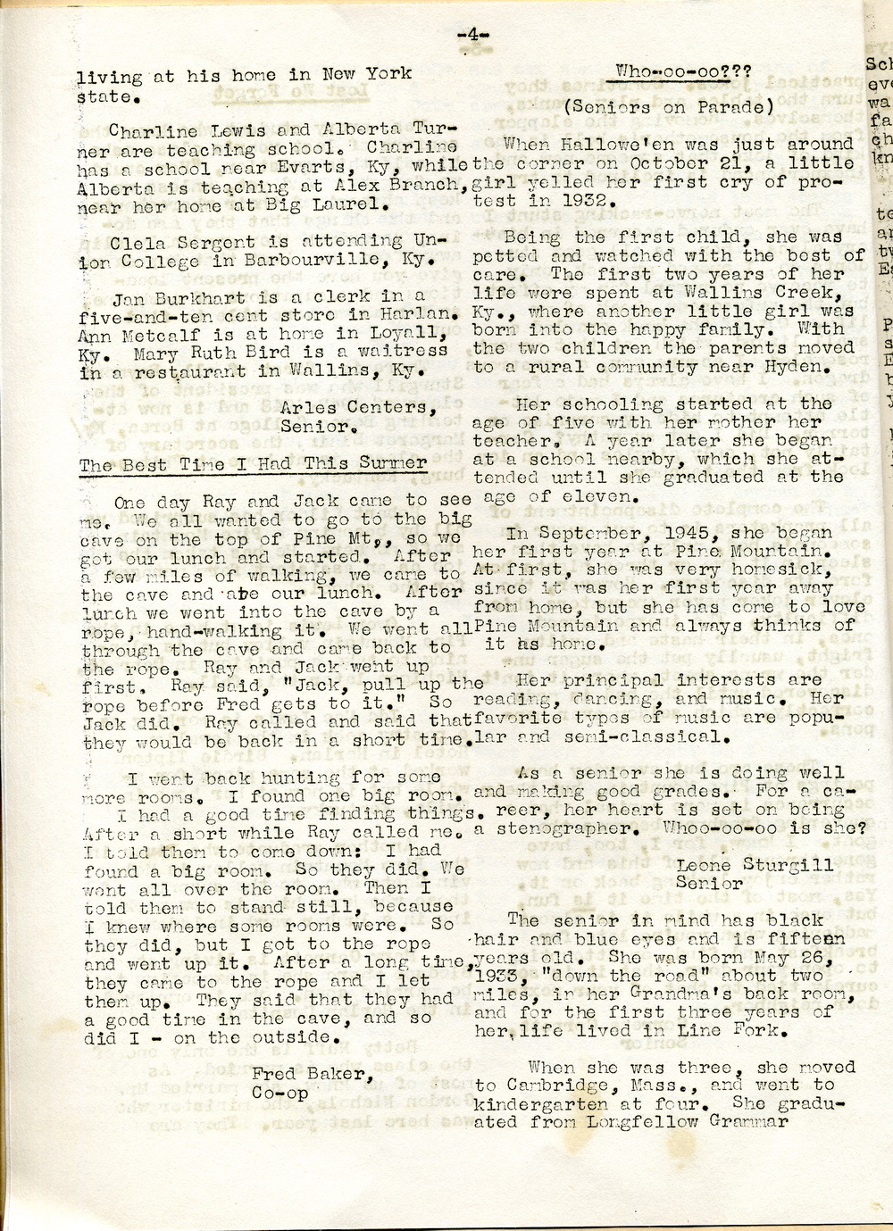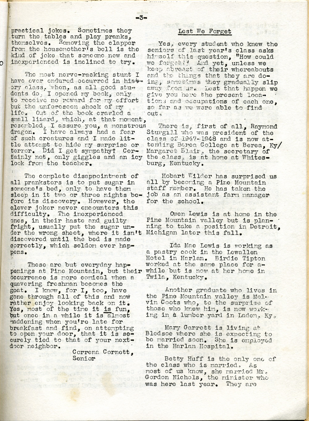 “Lest We Forget,” by Arles Centers. Reviews lives of former students: Raymond Sturgill at Berea; Margaret Blair at home in Whitesburg; Hobart Wilder staff member at PMSS; Owen Lewis at home in Pine Mountain valley; Ida Mae Lewis working as a pastry chef in Lewellen Hotel in Harlan; Birdie Tipton at home in Twila; Melvin Coots works in lumber yard in London, KY; Mary Garrett is employed at Harlan Hospital and living at Bledsoe; Betty Huff just married to Gordon Nichols, minister, now in New York; Charline Lewis is teaching school in Evarts; Alberta Turner is teaching school at Alex Branch near Big Laurel, KY; Clela Sergent is attending Union College in Barbourville, KY; Jan Burkhart is a clerk in Harlan store; Ann Metcalf is at home in Loyall, KY; Mary Ruth Bird is waitress in Wallins, KY.