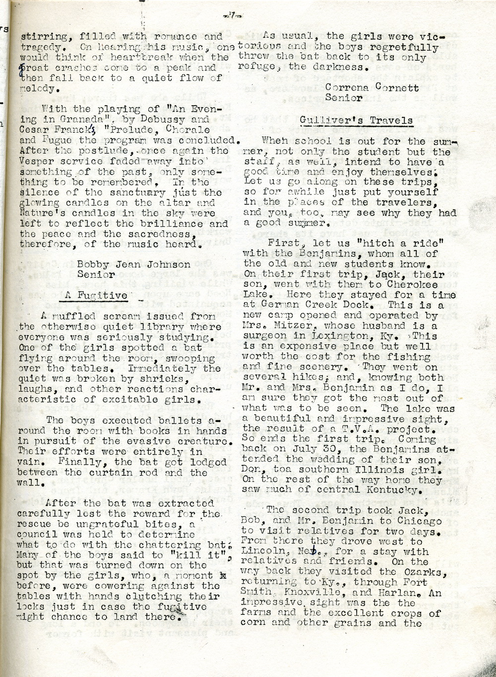 “Gulliver’s Travels” by Bobbie Johnson [Details the travels of staff during summer months: H.R.S. Benjamin; Jack Robb; Miss Merrill; Miss Spinney; Mr. and Mrs. Starbuck; Margaret Nace; Miss [Grace] Rood; Miss Alice Joy Keith; Wilbur Wilder; Arthur Dodd]
