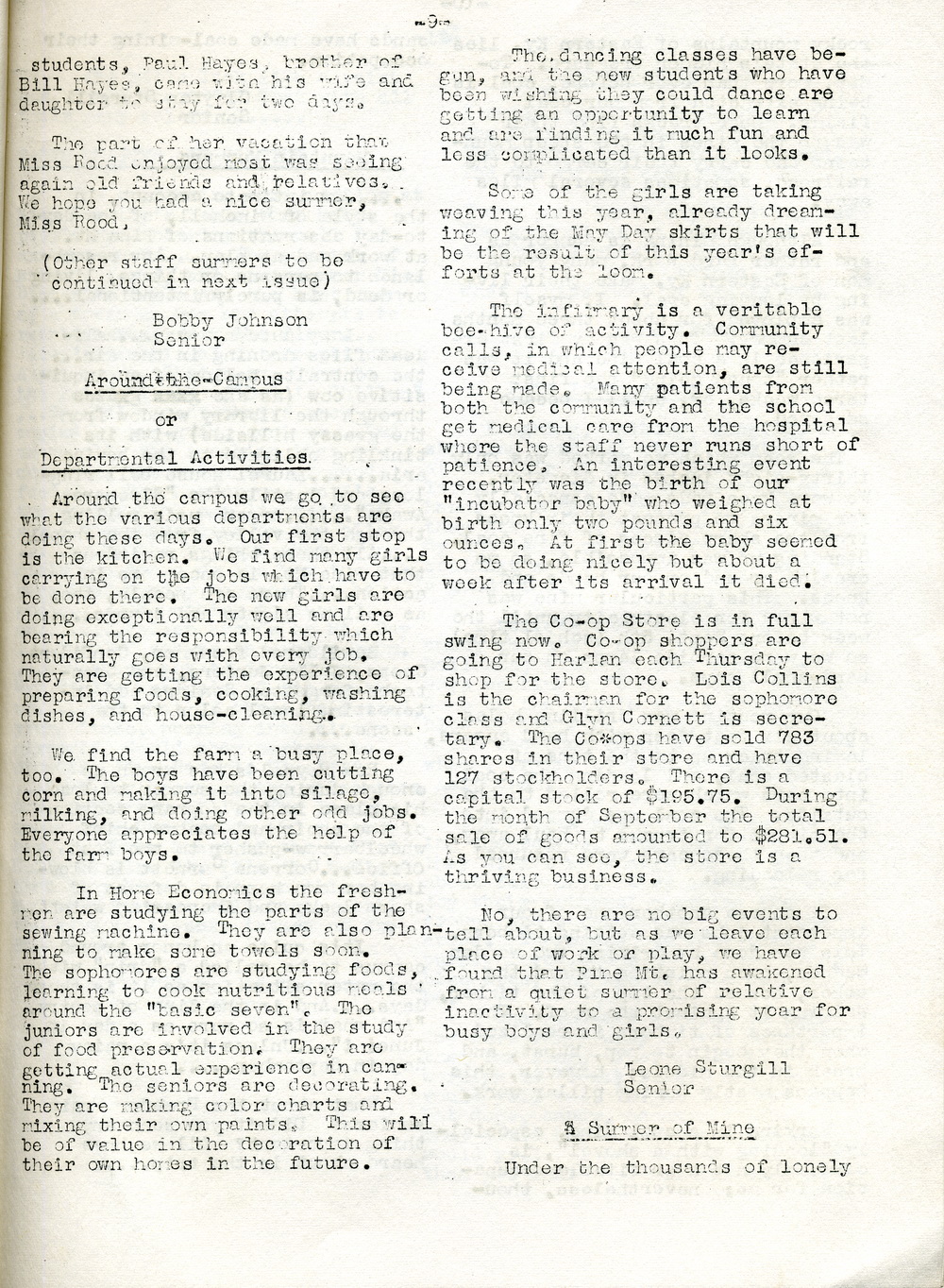 “Around the Campus or Departmental Activities,” by Leone Sturgill [Review of activities in the Kitchen, Farm, Home Economics; Dancing; Weaving; Infirmary; Co-op;]