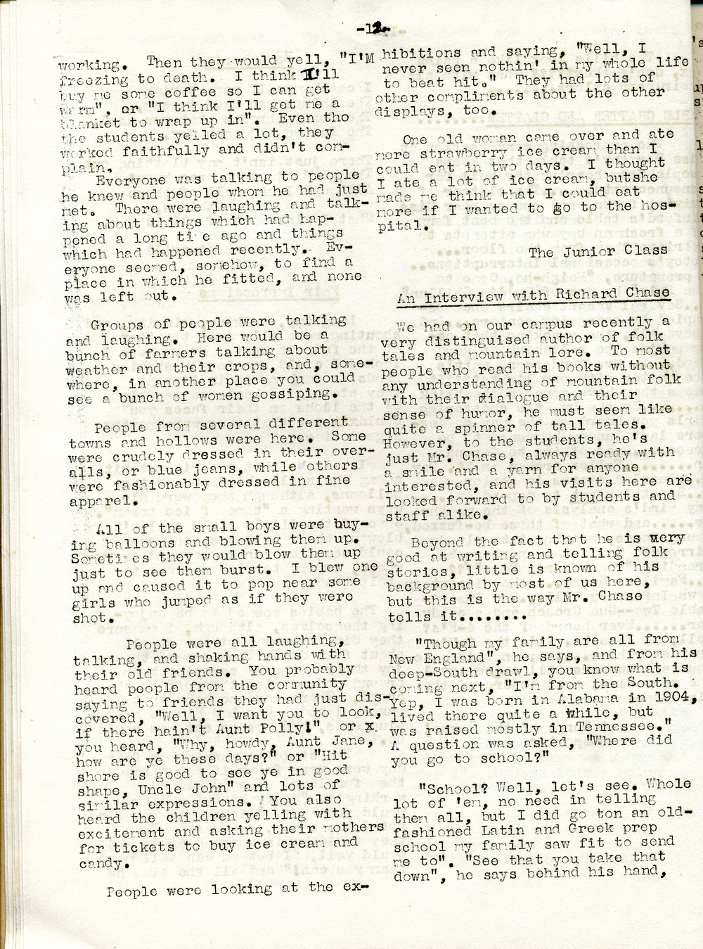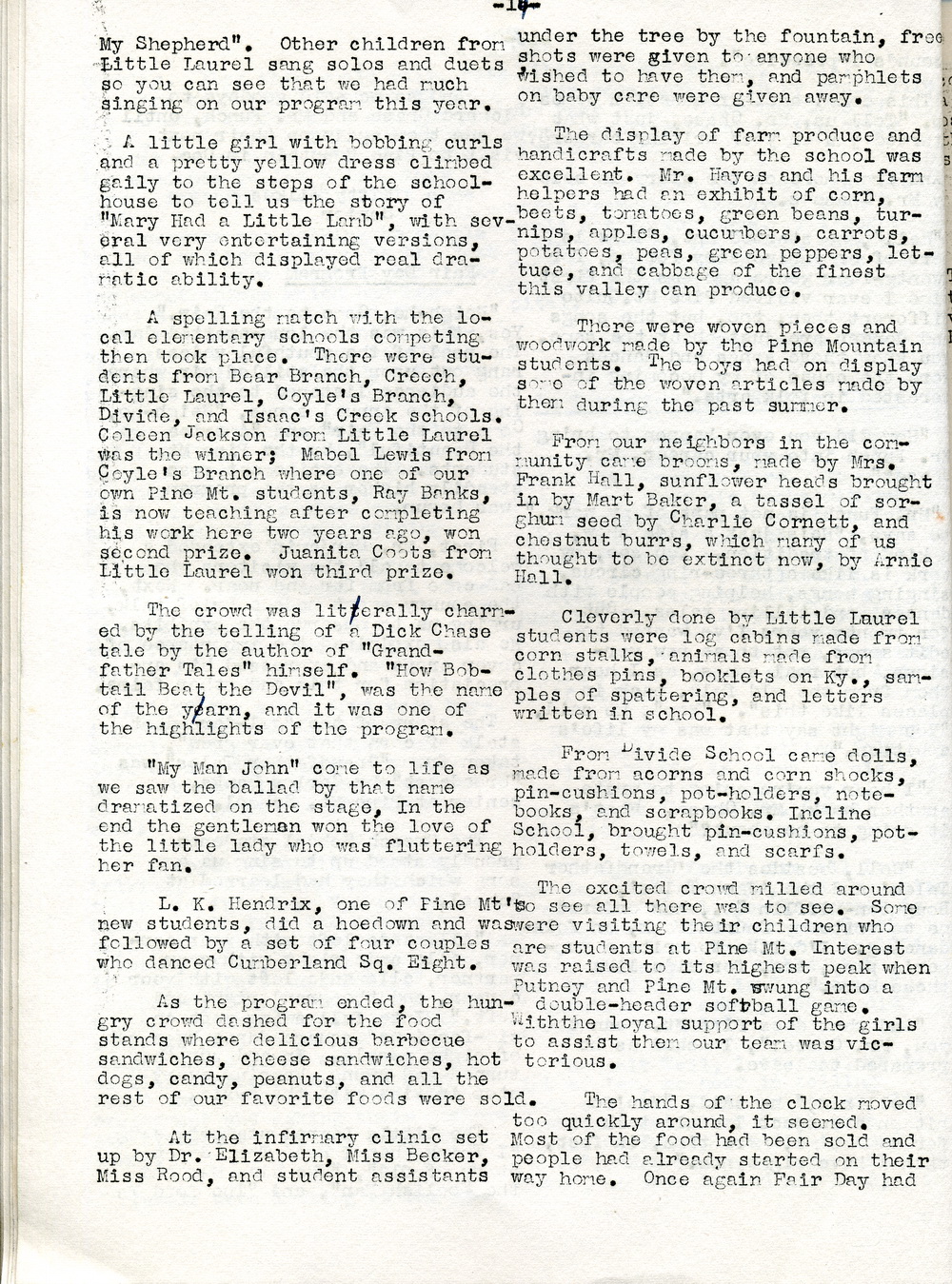 (cont.) “Fair Day Program” by Leone Sturgill: singing, spelling match, Dick Chase tale, dramatization, hoedown, dancing, food, infirmary clinic (set up by Dr. Elizabeth, Miss Becker, Miss Rood and student assistants), displays of farm produce (Mr. Hayes) and handicrafts, softball game.