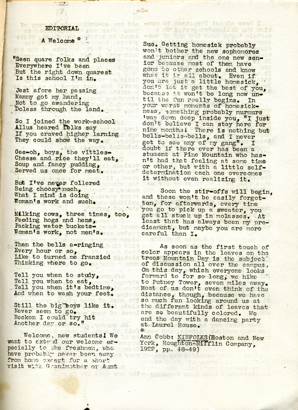 “Editorial” by Bonnie Reynolds – A Welcome discusses “homesickness” [Ann Cobb, ‘Kinfolks’ poem (Boston and New York, Houghton-MIfflin Company, 1922, pp. 48-49)]. Comments on Fall activities including stir-off and Mountain Day, Halloween, Senior Bazaar, Nativity Play.