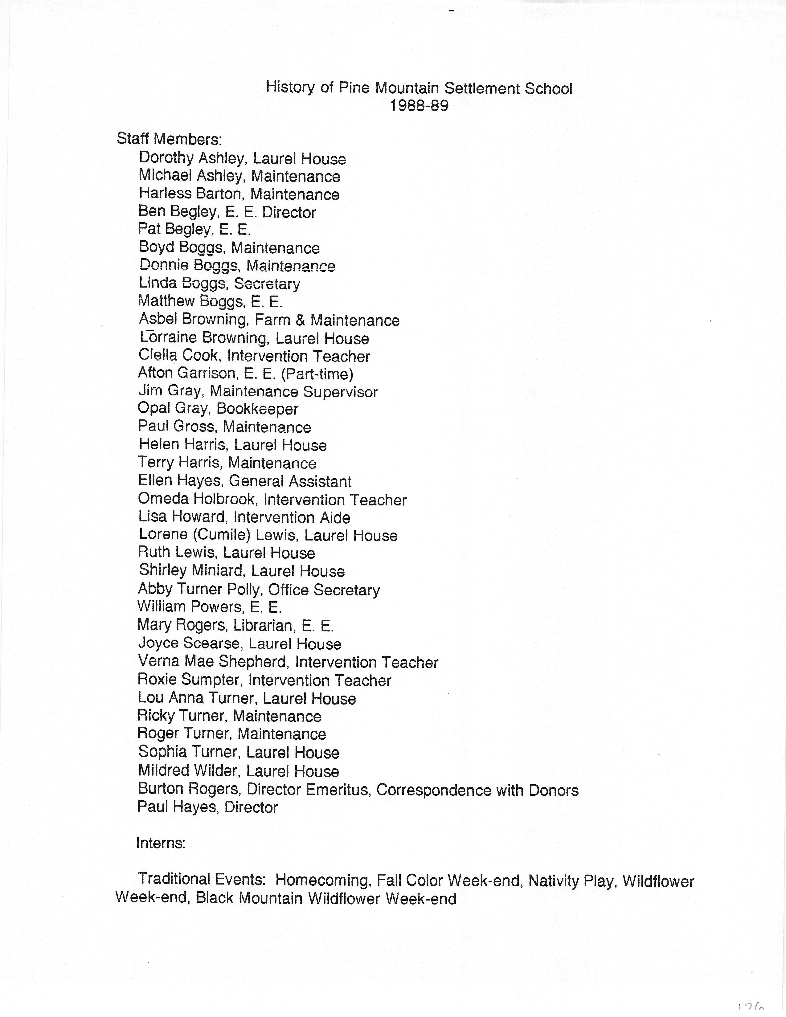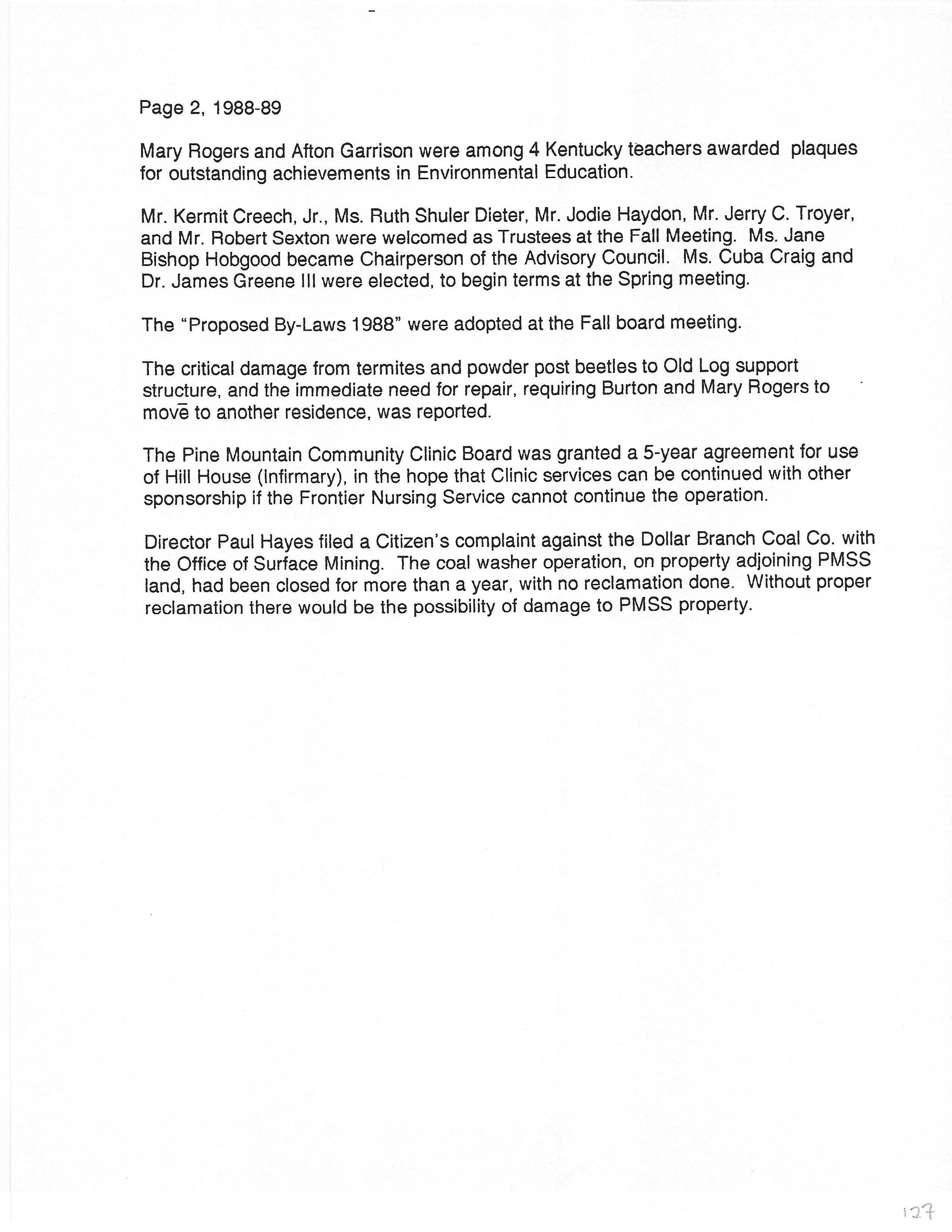 Tags: History PMSS summary 1988-1989, staff members, interns, traditional events, other events, teacher awards, trustees, by-laws, Old Log, clinics, citizen’s complaints, Dollar Branch Coal Co.