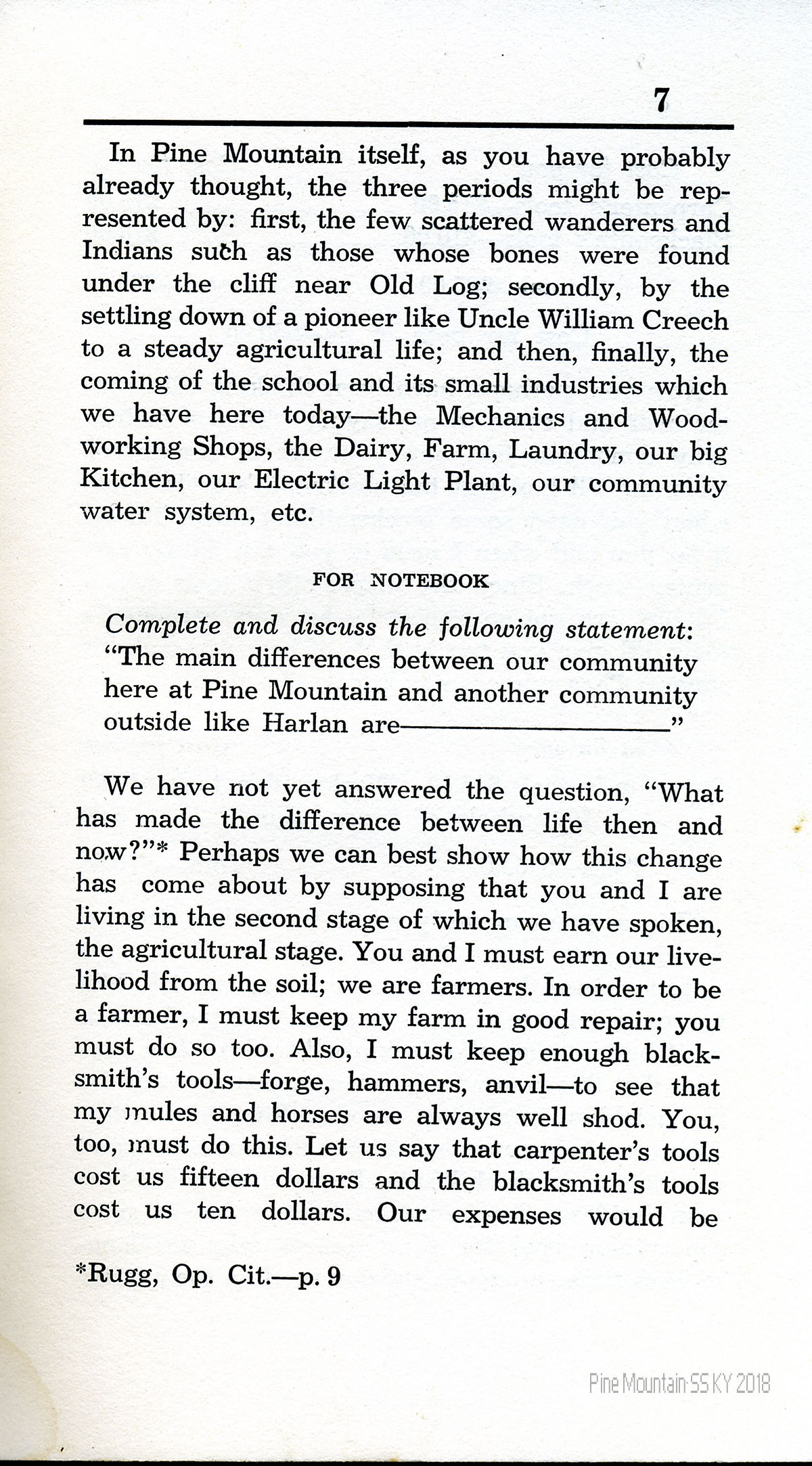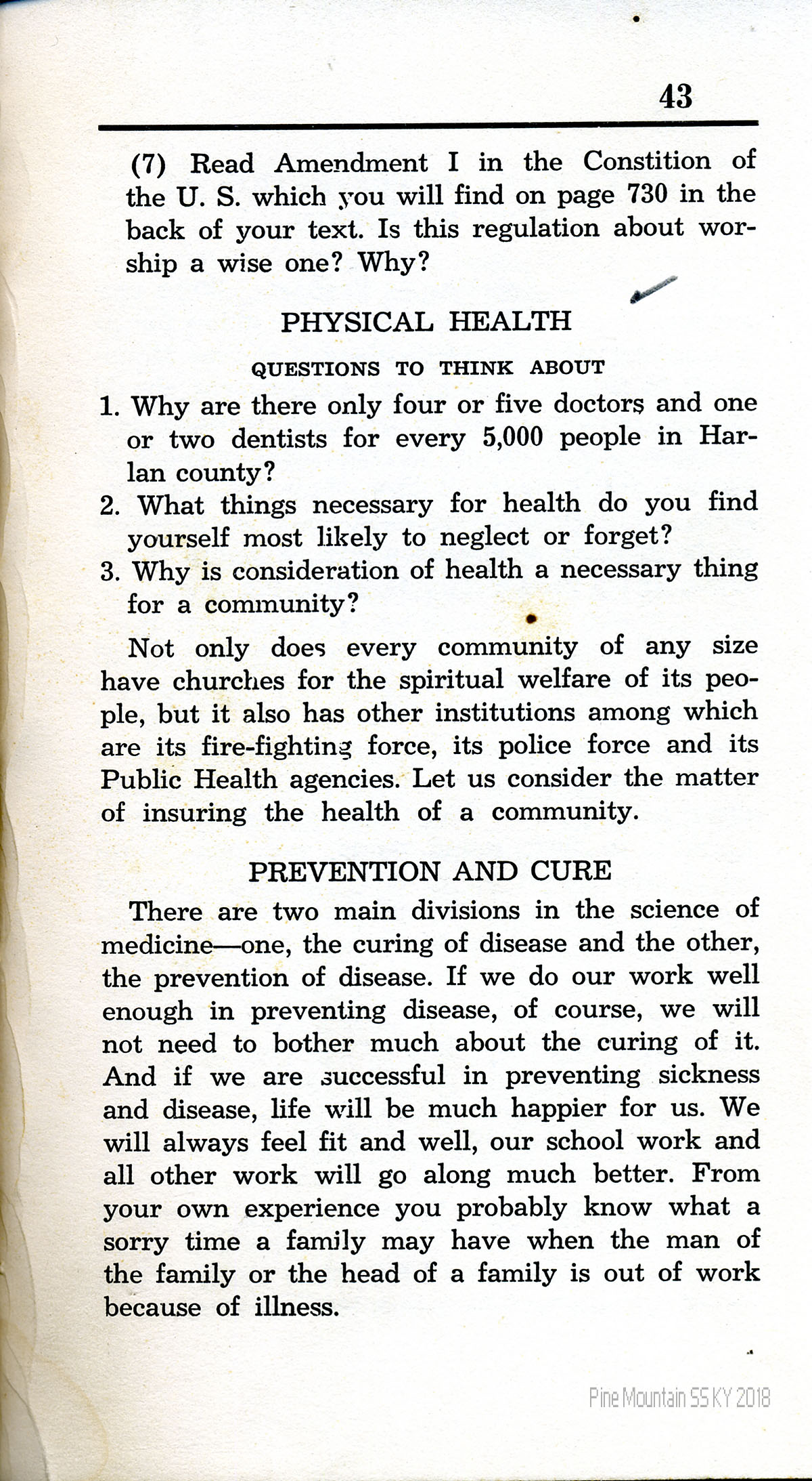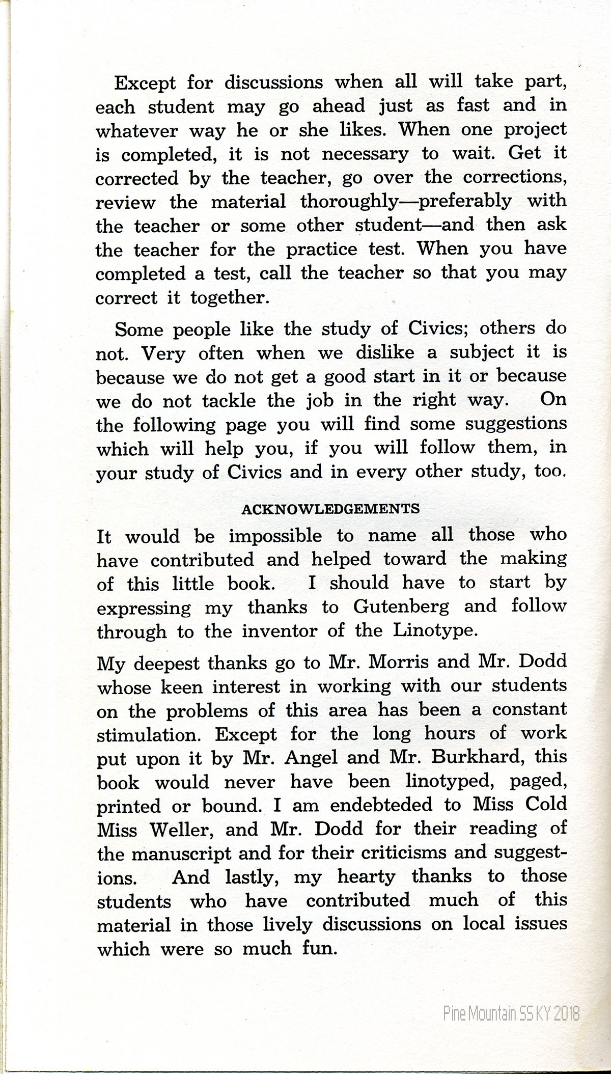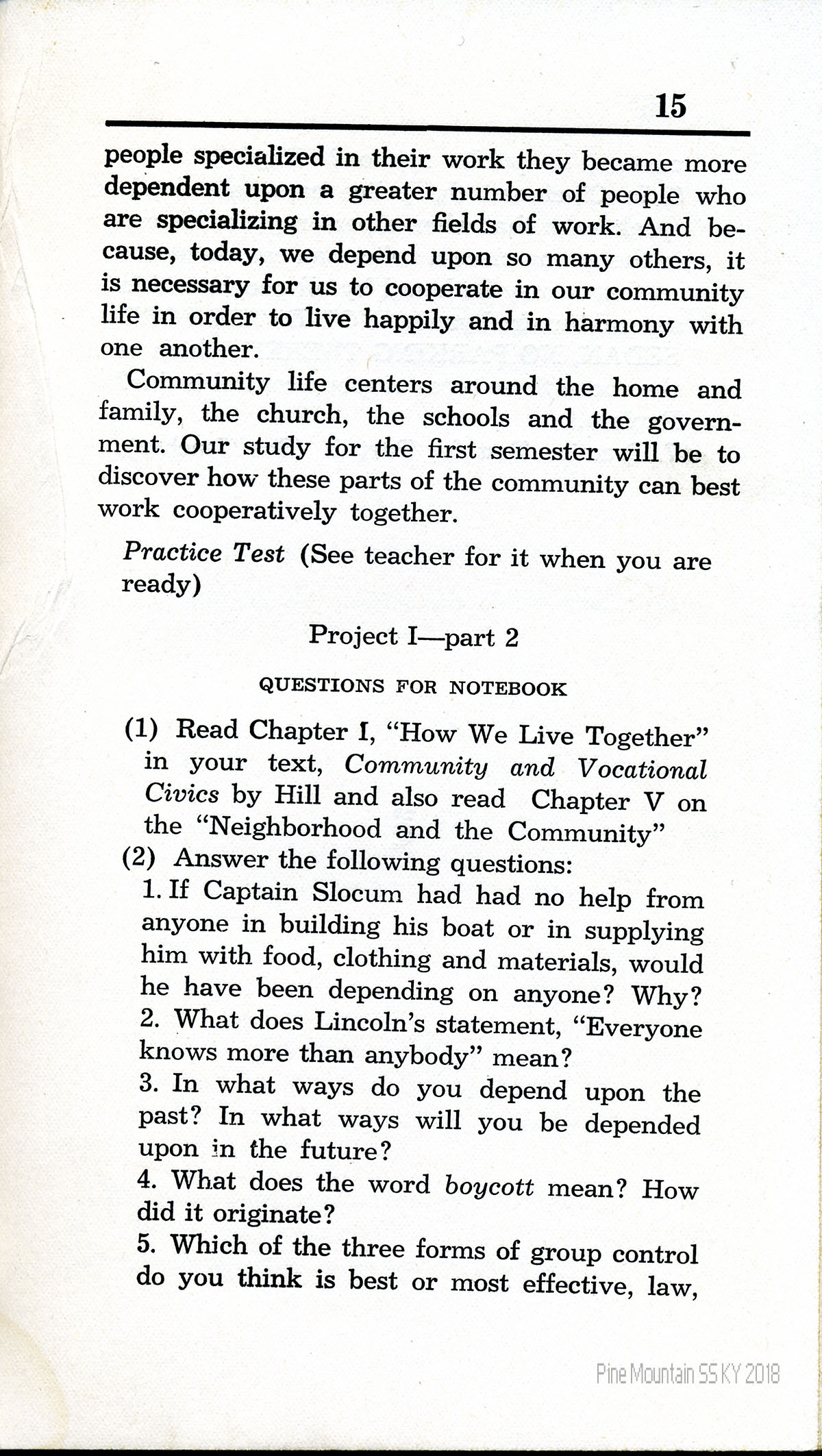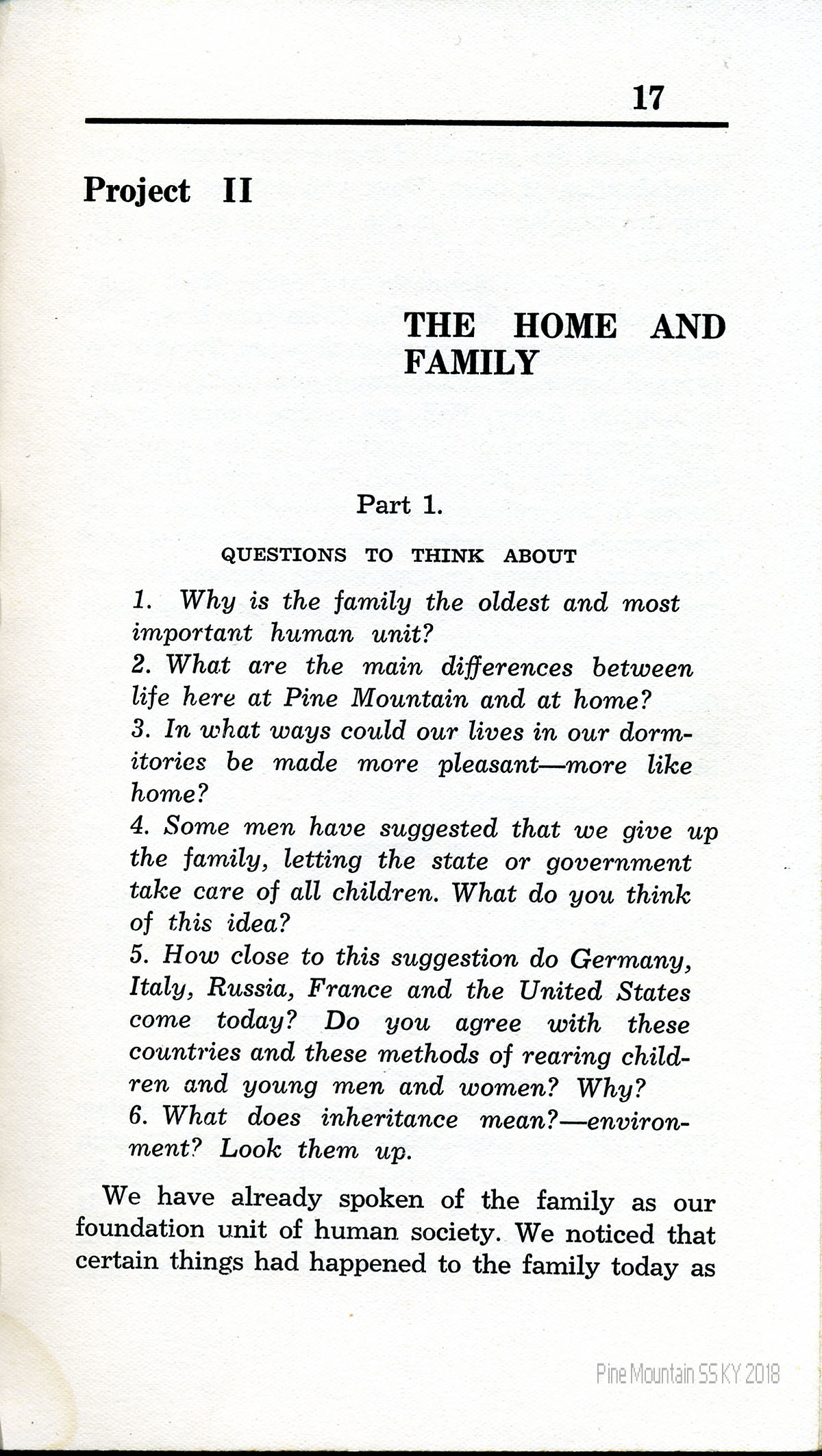 This is a tool for educating good citizens to engage their civic responsibilities. Today stand-alone civics courses rarely show up in the general high-school curriculum and certainly, few are mapped so carefully to their specific community. Today it is also rare to find any secondary course as compulsory and comprehensive as this small book which is focused on a cohort experience. All students at Pine Mountain were compelled to take the civics course during their Boarding School years. The course follows the developing county-wide educational goals were explored and ultimately integrated into the development of the Rural Youth Guidance Institute a county-wide educational planning initiative begun by Glyn Morris (PMSS Director 1931-1941).