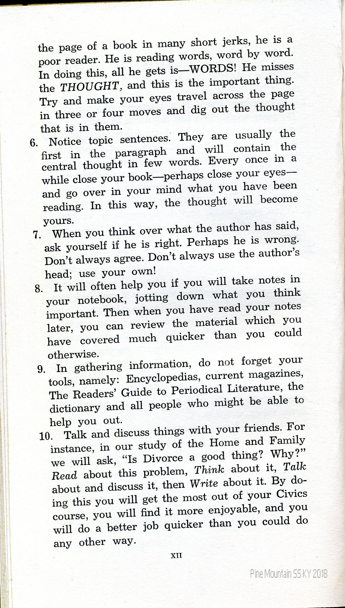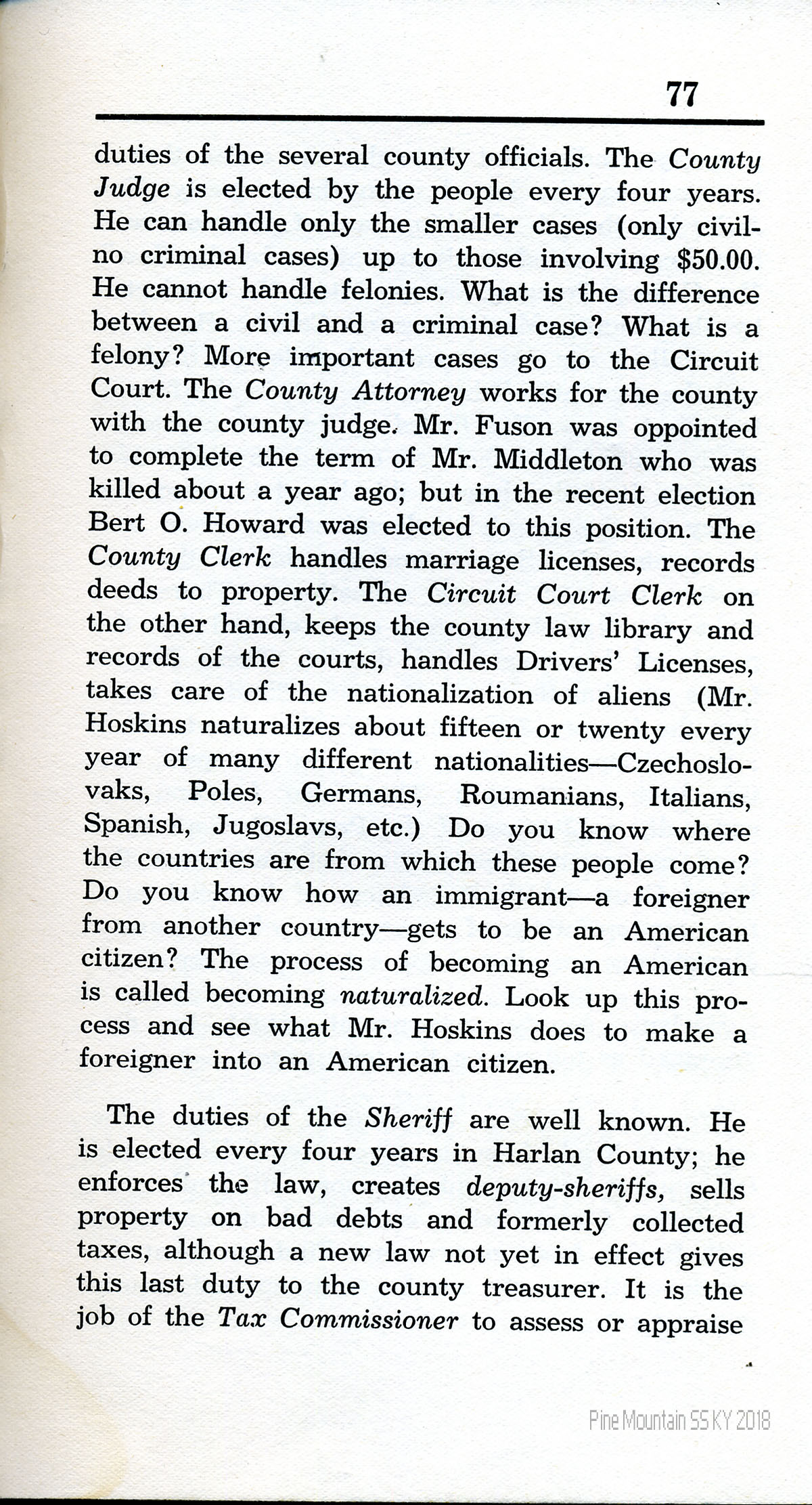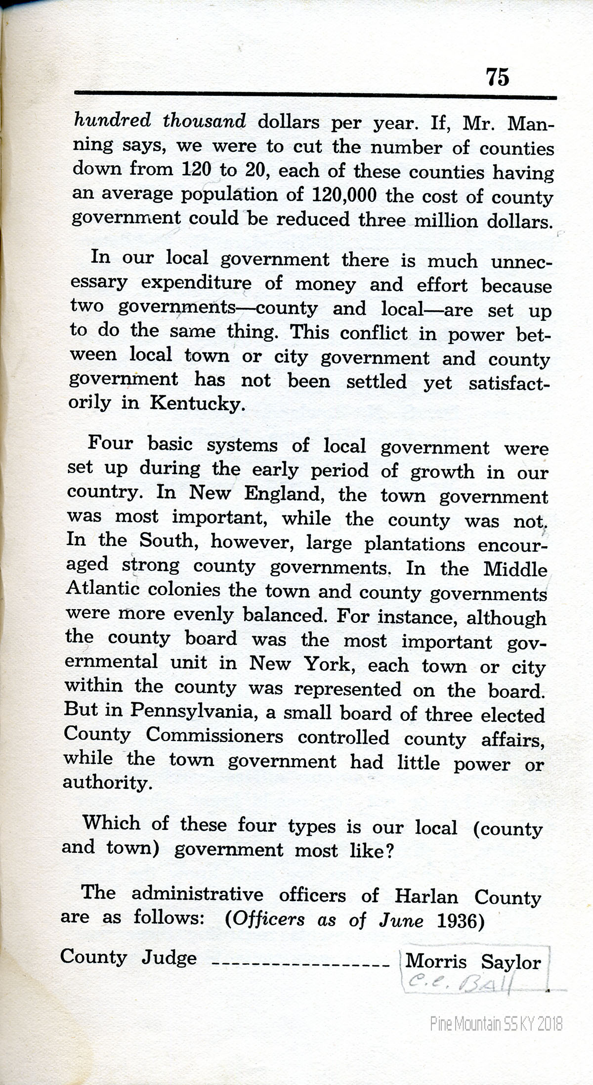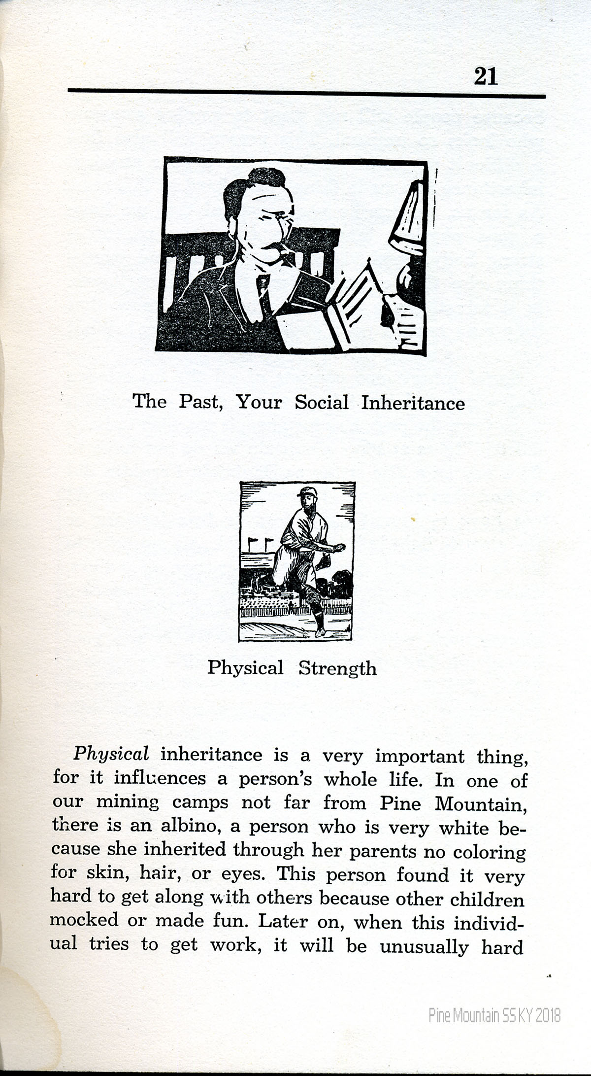 This is a tool for educating good citizens to engage their civic responsibilities. Today stand-alone civics courses rarely show up in the general high-school curriculum and certainly, few are mapped so carefully to their specific community. Today it is also rare to find any secondary course as compulsory and comprehensive as this small book which is focused on a cohort experience. All students at Pine Mountain were compelled to take the civics course during their Boarding School years. The course follows the developing county-wide educational goals were explored and ultimately integrated into the development of the Rural Youth Guidance Institute a county-wide educational planning initiative begun by Glyn Morris (PMSS Director 1931-1941).