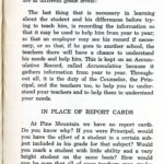 … At Pine Mountain, we have no report cards. Do you know why? If you were Principal, would you have the effort of a student in a certain subject included in his grade for that subject? Would you mark a student with little ability and a very bright student on the same basis? How would you be sure that all of your teachers gave grades on the same basis? …[Wilson]