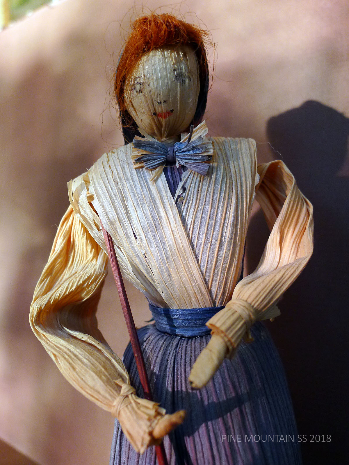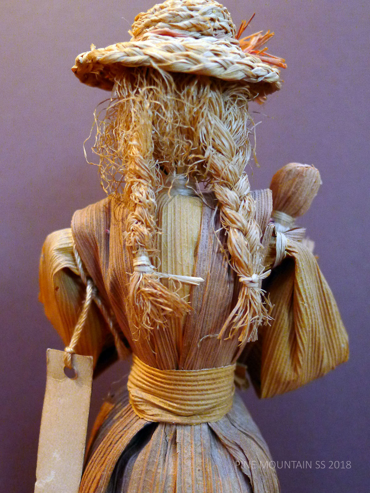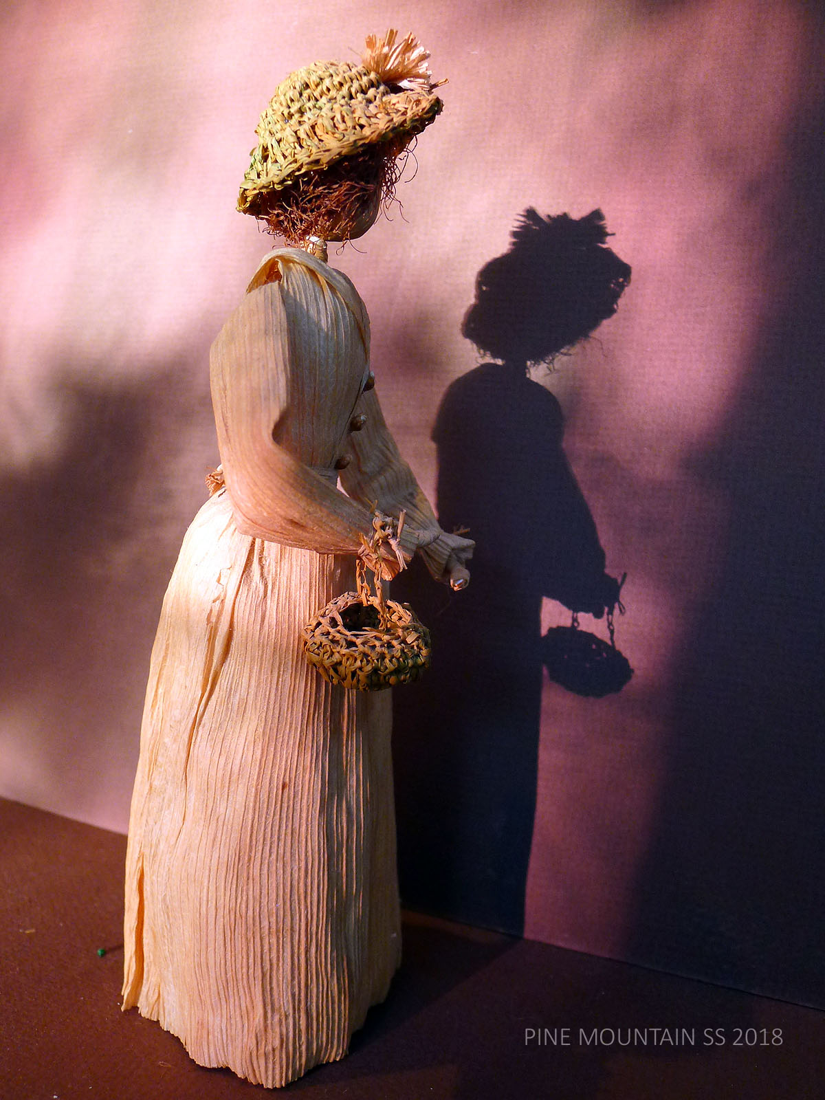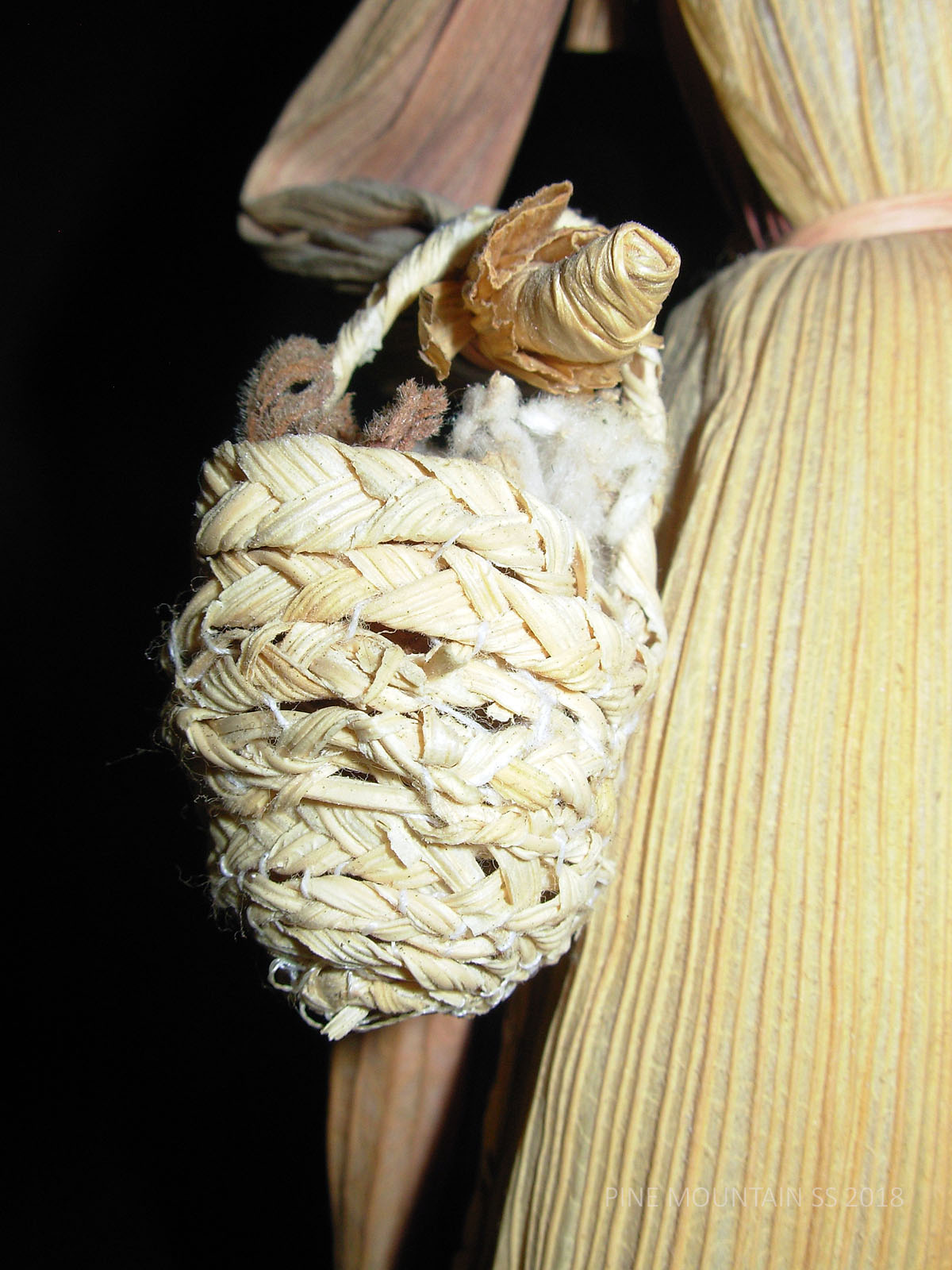 The husks used in the doll’s construction were not from local mountain harvests but came from California where there was a ready supply of tamale husks that are sturdier, more uniform. The cleaner and sturdier husks, dyed before assembling, have now mellowed from their more vibrant original state. Hats and baskets are often crocheted or woven with flat grass or plant stems. Interior wire makes the arms of each doll somewhat flexible. The head is a husk pulled tightly around a hard ball of cotton. Jewel, when asked how many dolls she had made, once remarked that she had “used a mattress stuffing their heads with cotton.”