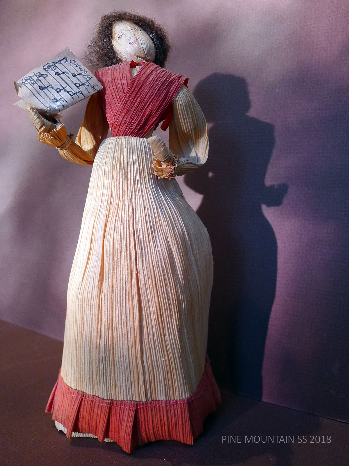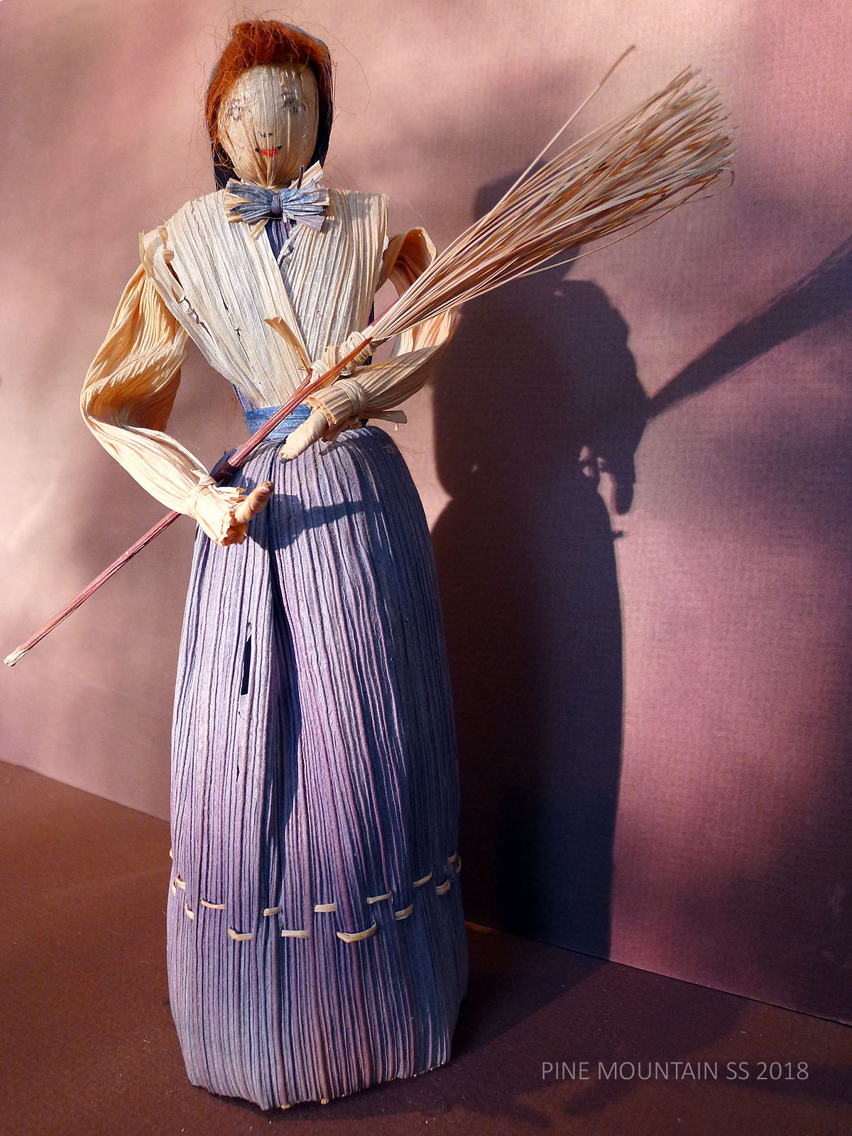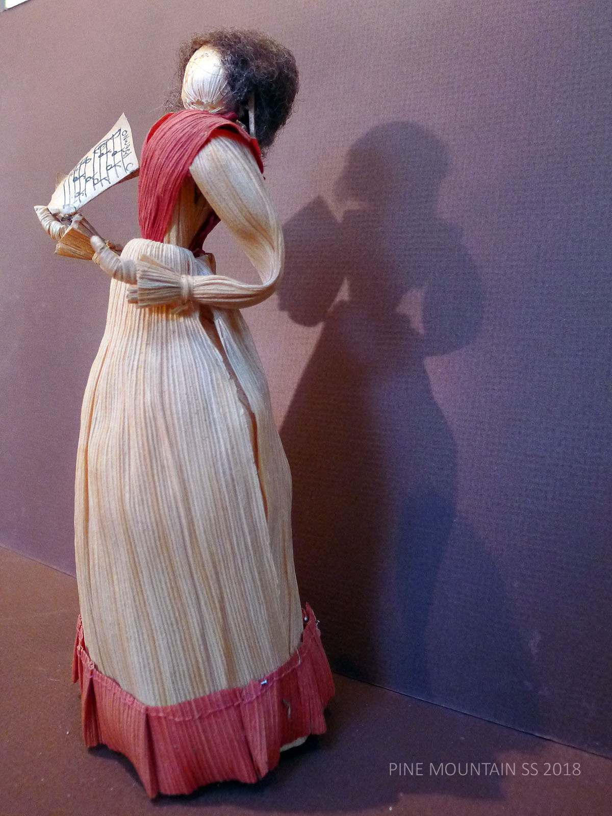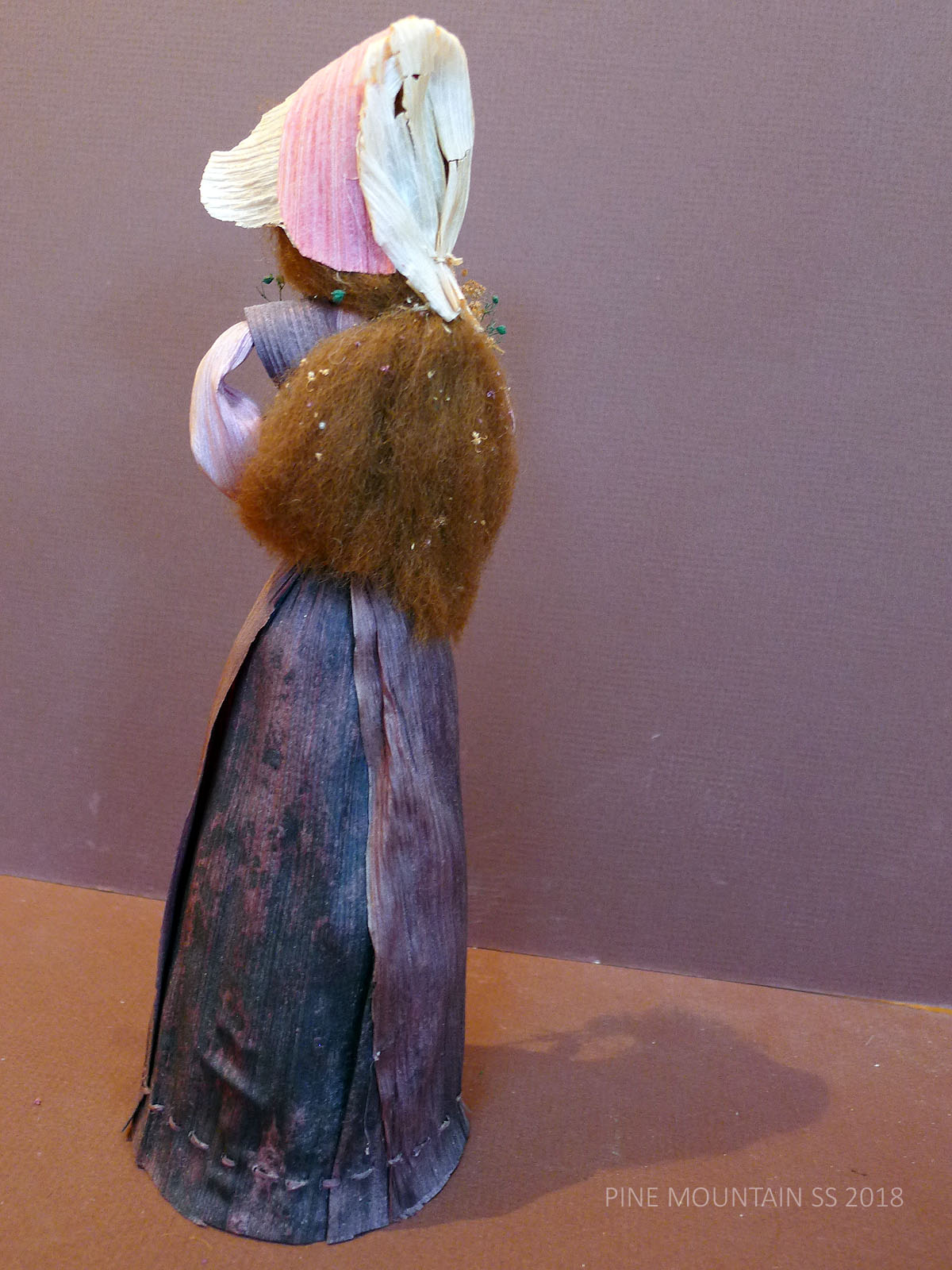 The husks used in the doll’s construction were not from local mountain harvests but came from California where there was a ready supply of tamale husks that are sturdier, more uniform. The cleaner and sturdier husks, dyed before assembling, have now mellowed from their more vibrant original state. Hats and baskets are often crocheted or woven with flat grass or plant stems. Interior wire makes the arms of each doll somewhat flexible. The head is a husk pulled tightly around a hard ball of cotton. Jewel, when asked how many dolls she had made, once remarked that she had “used a mattress stuffing their heads with cotton.”