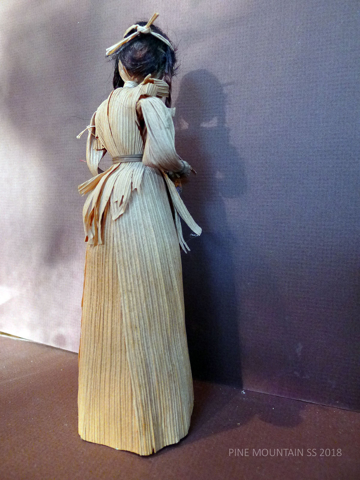 Almost all the dolls are approximately 8″ – 8.5″ tall, limited somewhat by the size of the husks. The dolls in this display have not retained much of the intensity of the original dye used to color the husk garments, baskets, and hats. Generally, the corn husks were purchased in their natural state and then dyed with synthetic dyes, such as RIT — some dyes have been more stable than others. The later originals are often more vibrant with color.