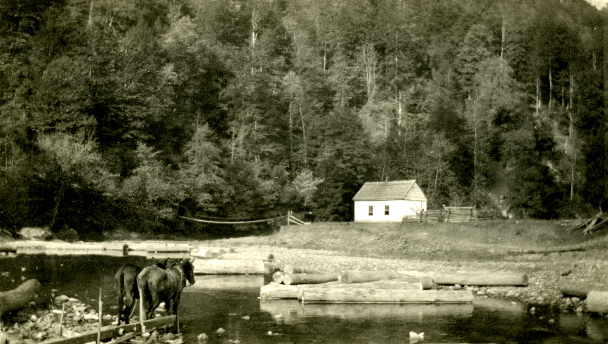- White church on Greasy Creek with two mules in harness and logs. hook_album_2blk__004.jpg