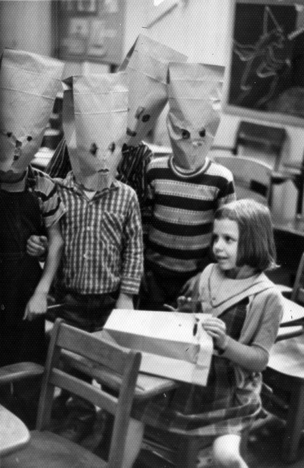 - 1809 Halloween in Mrs. Whitaker’s Room: Norma Callahan and 4 masked students. [58_Life and Work_Children and Classes_018.jpg]