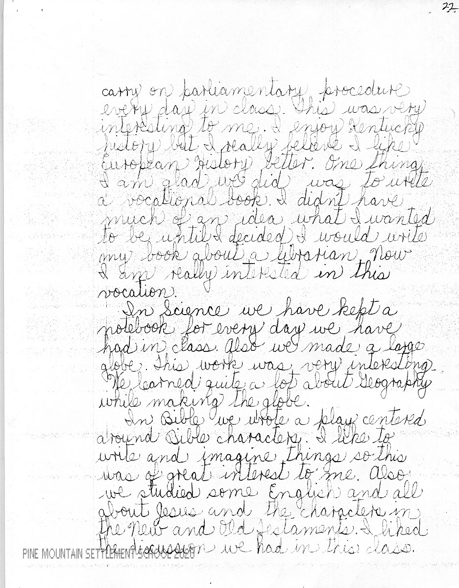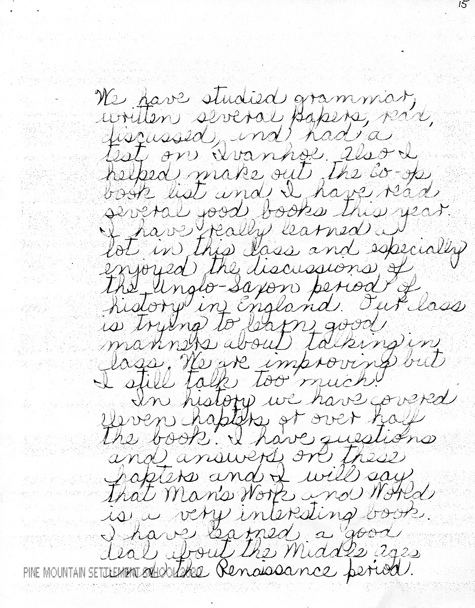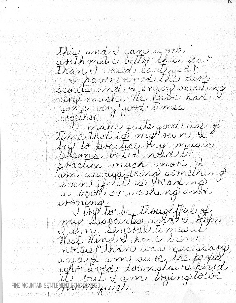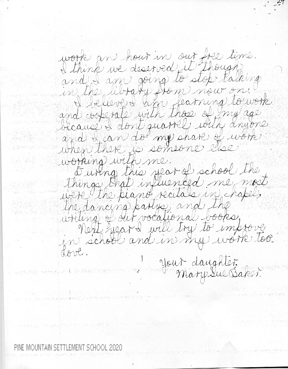 I am enclosing a letter from Mary Sue in which she has tried to evaluate herself both in her studies and in other phases of her life at Pine Mountain. We feel very strongly the importance of self-analysis and criticism, for the best personal development comes as a result of this.