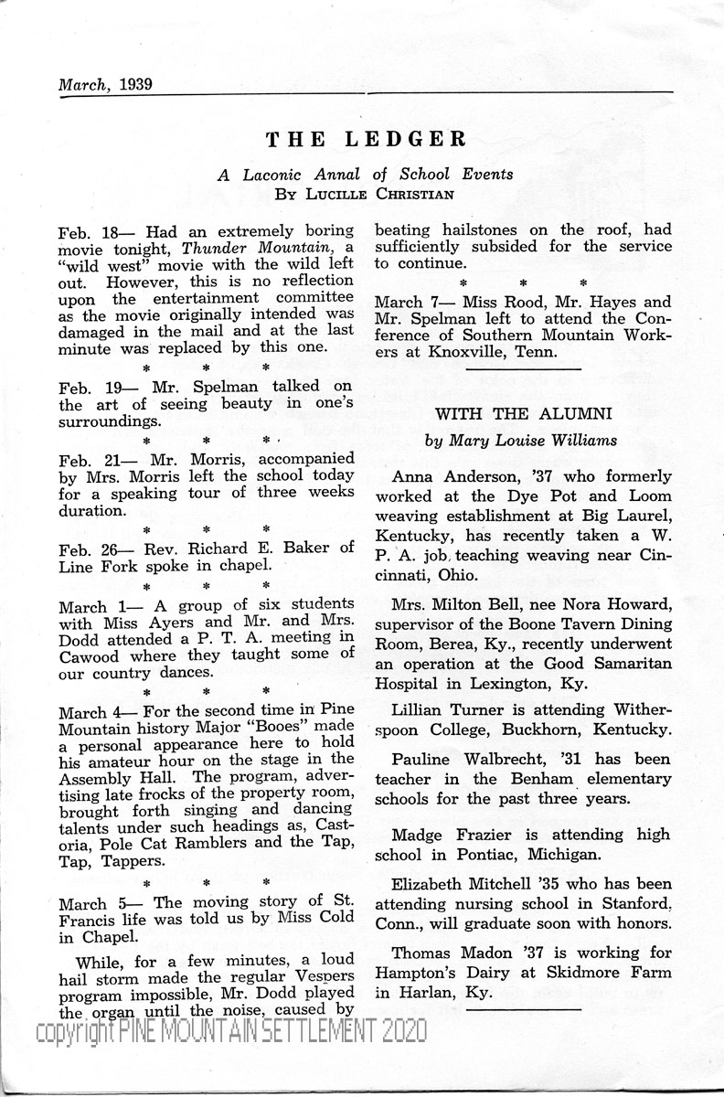 Mar. 7 – Miss [Grace] Rood, Mr. [William] Hayes and Mr. [John] Spelman attended Conference of Southern Mt. Workers in Knoxville, TN.