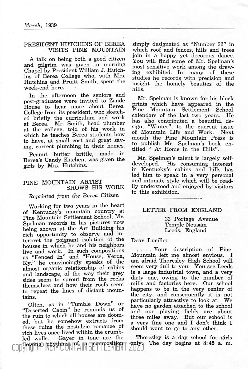 PRESIDENT [William J.] HUTCHINS OF BEREA VISITS PINE MOUNTAIN – Gave talk on being a good citizen and pilgrim and, with Mrs. Hutchins and Pruitt Smith (head plumber at Berea), spent the weekend at PMSS; seniors and post-graduates met Hutchins later at Zande House to hear about Berea College.