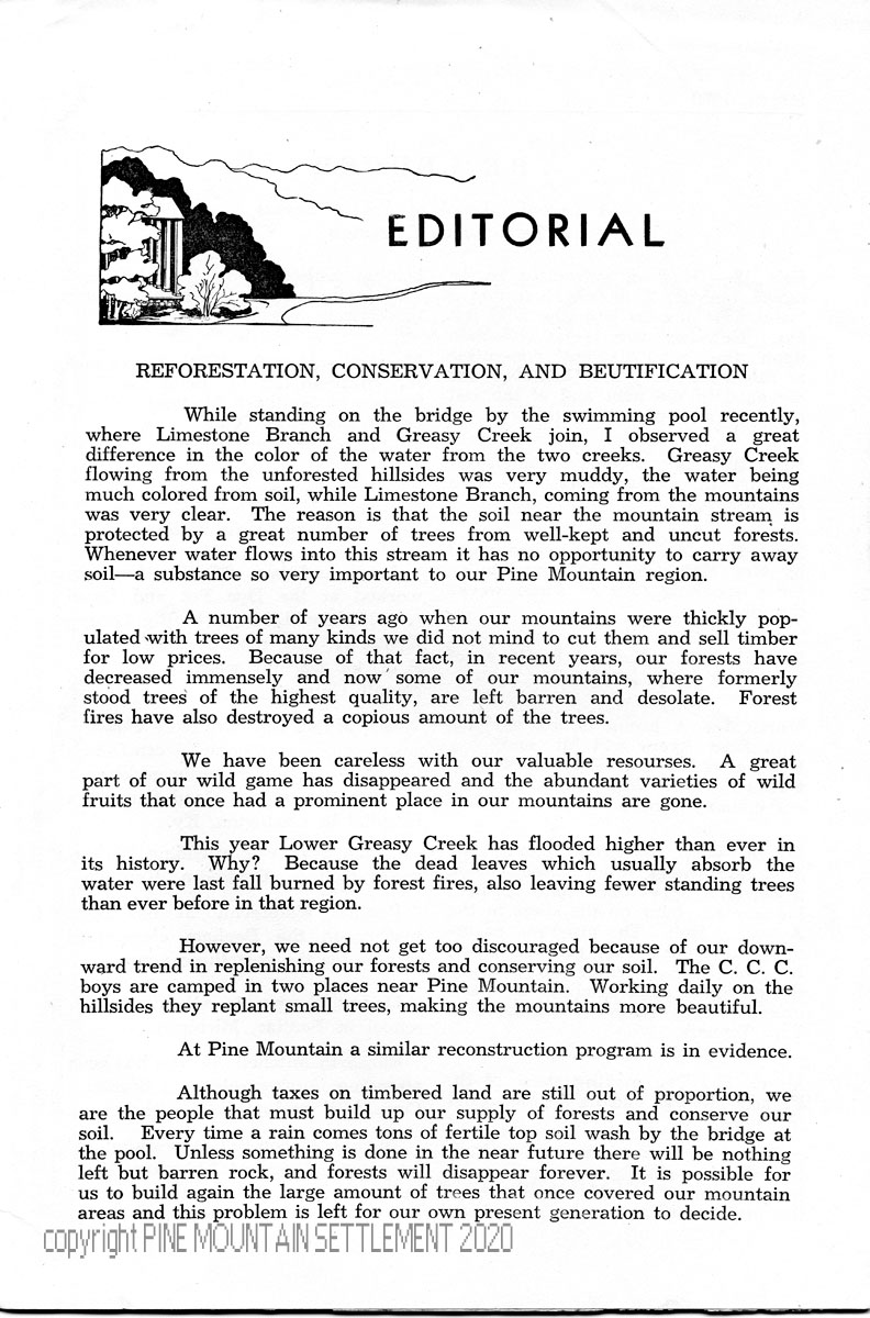 difference between the waters in Greasy Creek and Limestone Branch; effects of former logging practices and forest fires; disappearances of wild game and fruits; reason for flooding; reforestation by C.C.C. boys; “…we are the people that must build up our supply of forests and conserve our soil.”